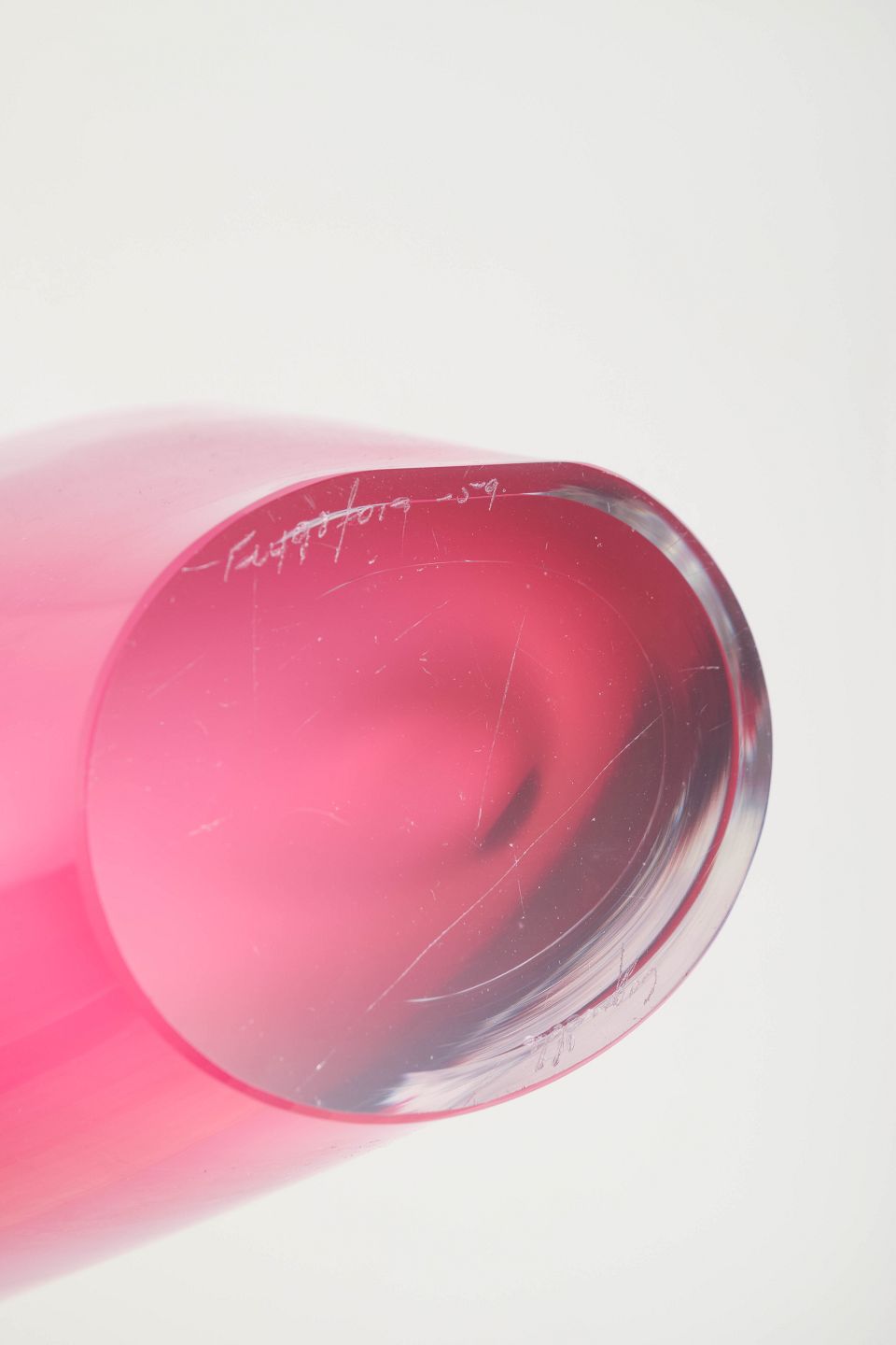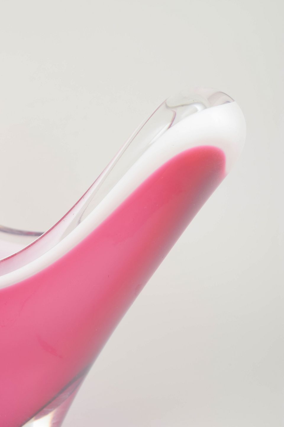 Impressive “Coquille” bowl in layered art glass with deep pink colouring encased in clear glass. The broad, sweeping V-shape is characteristic of Kedelv’s most iconic late-1950s designs.