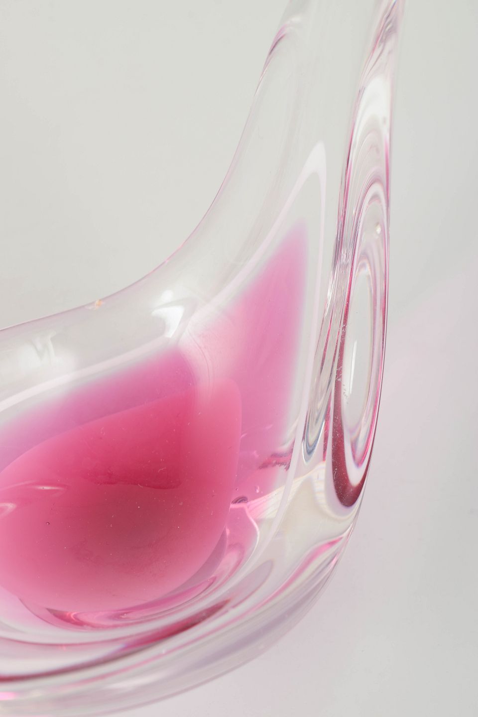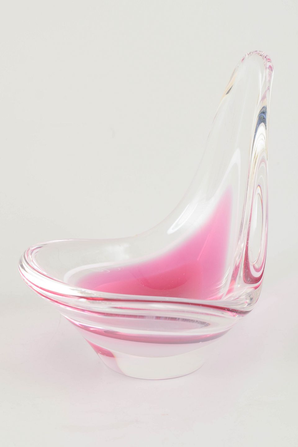 Elegant “Coquille” bowl in layered art glass with pink colouring encased in clear glass, featuring the characteristic asymmetrical, upward-curving form typical of Kedelv’s organic glass design.