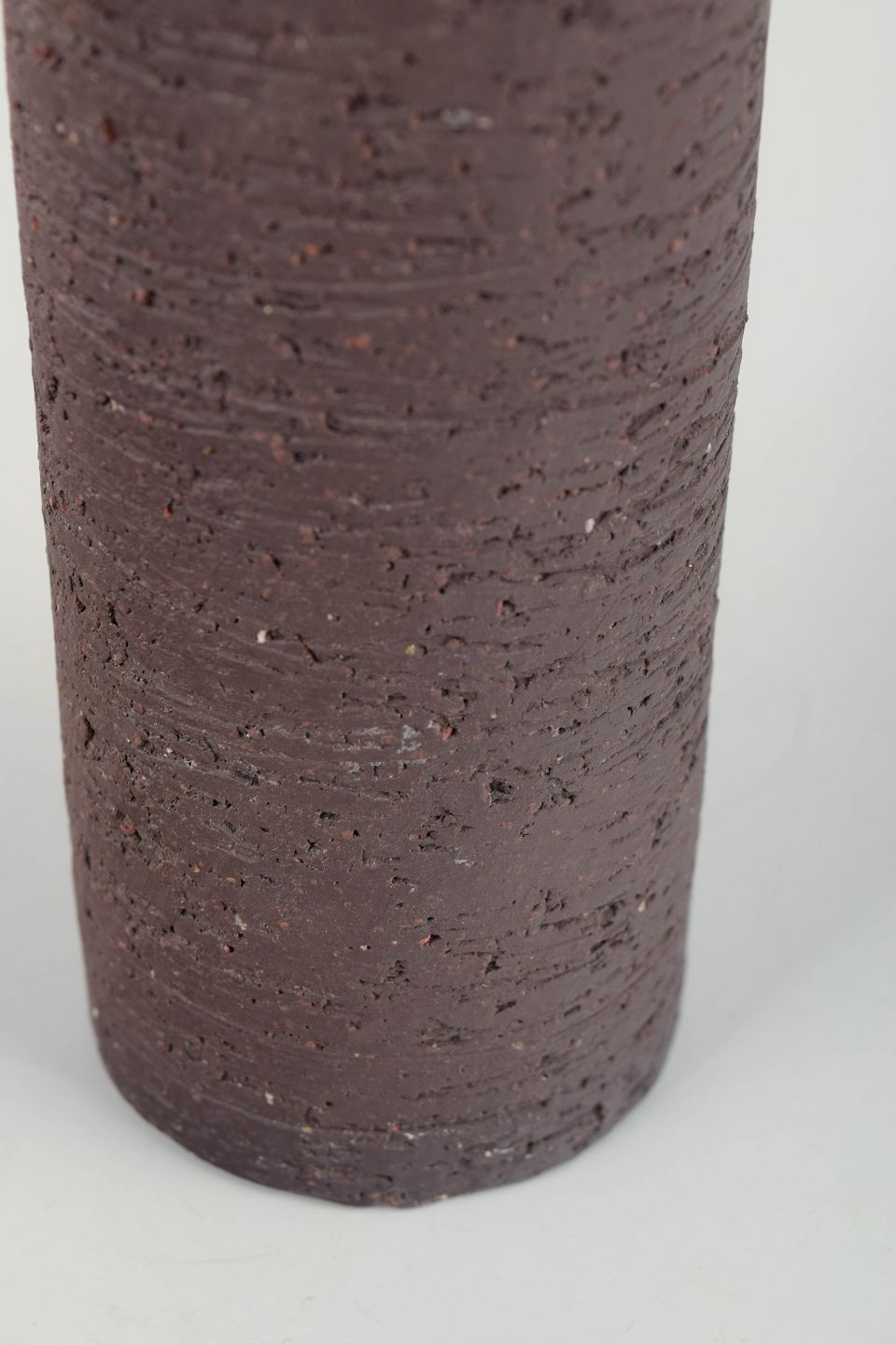 Cylindrical vase in characteristic chamotte stoneware with a raw, textured brown exterior and contrasting yellow glaze inside. A fine example of Nylund’s material-driven aesthetic from this period.