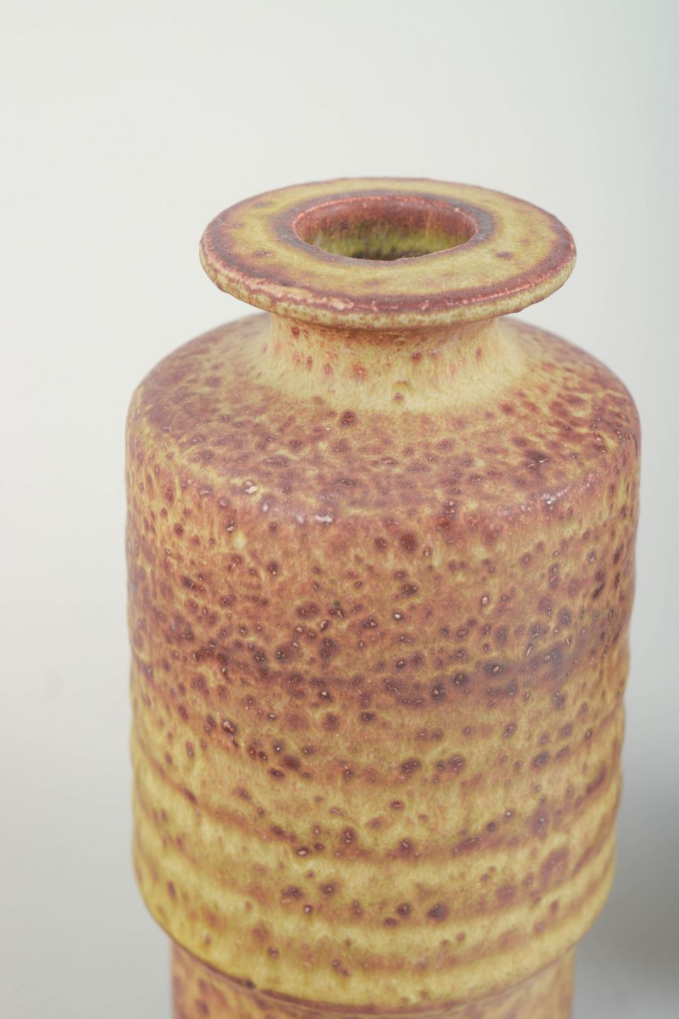 Pair of hand-thrown stoneware vases with the characteristic Mobach texture and matte, nuanced glazes in yellow and reddish-brown tones. The cylindrical forms and tactile surfaces are typical of the workshop’s modernist aesthetic.