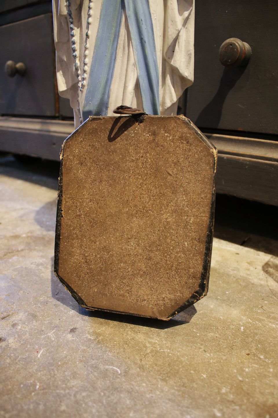 Decorative, old religious picture (with glass) with Jesus pictureand fine flower wreath in fabric.