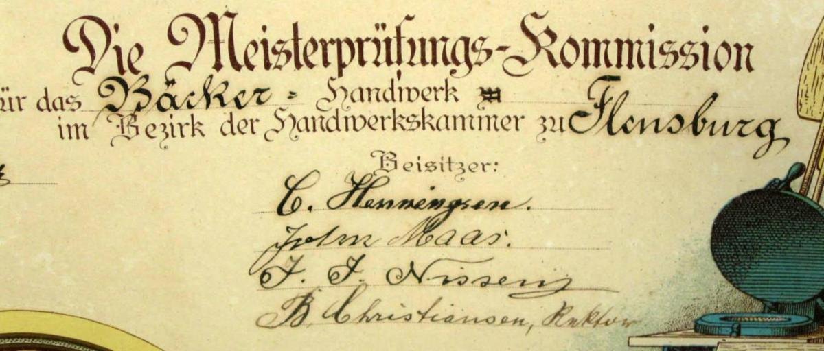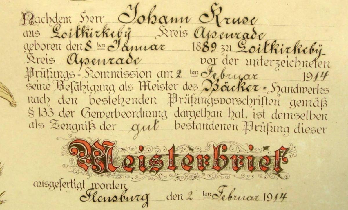 Master baker letter Løjt Kirkeby 1914. Master baker Johan Kruse. Lithography. 66 x 48 cm. In mahogany frame.Item number: 6260