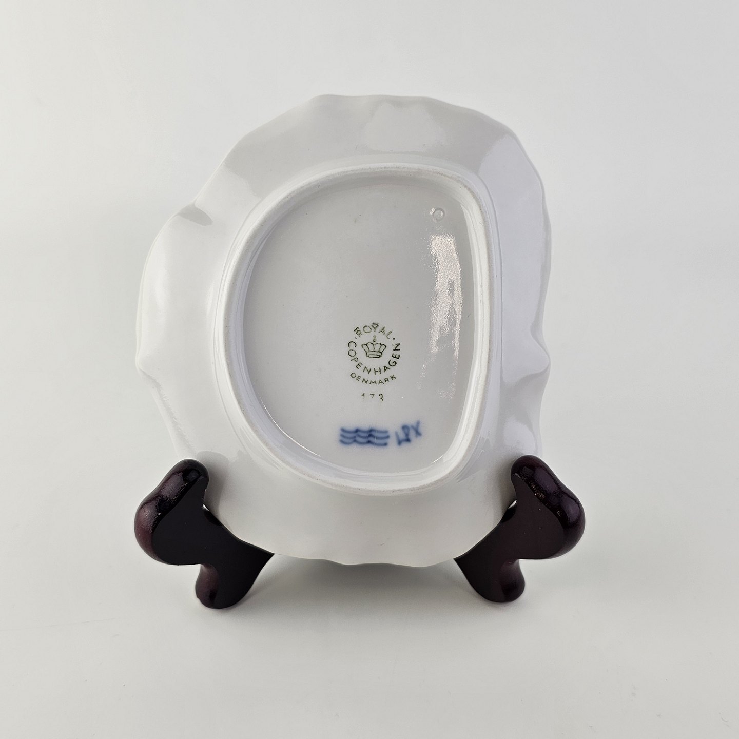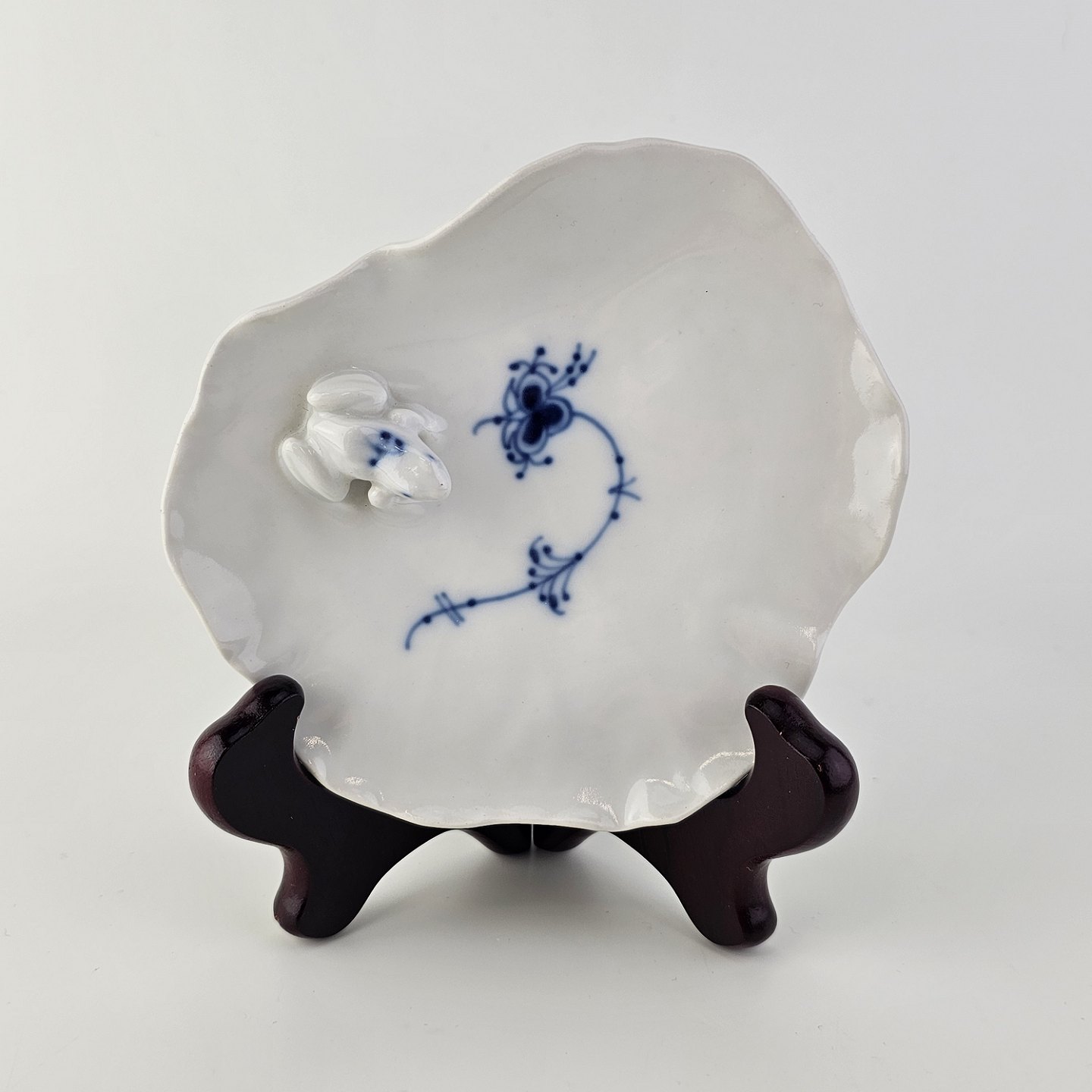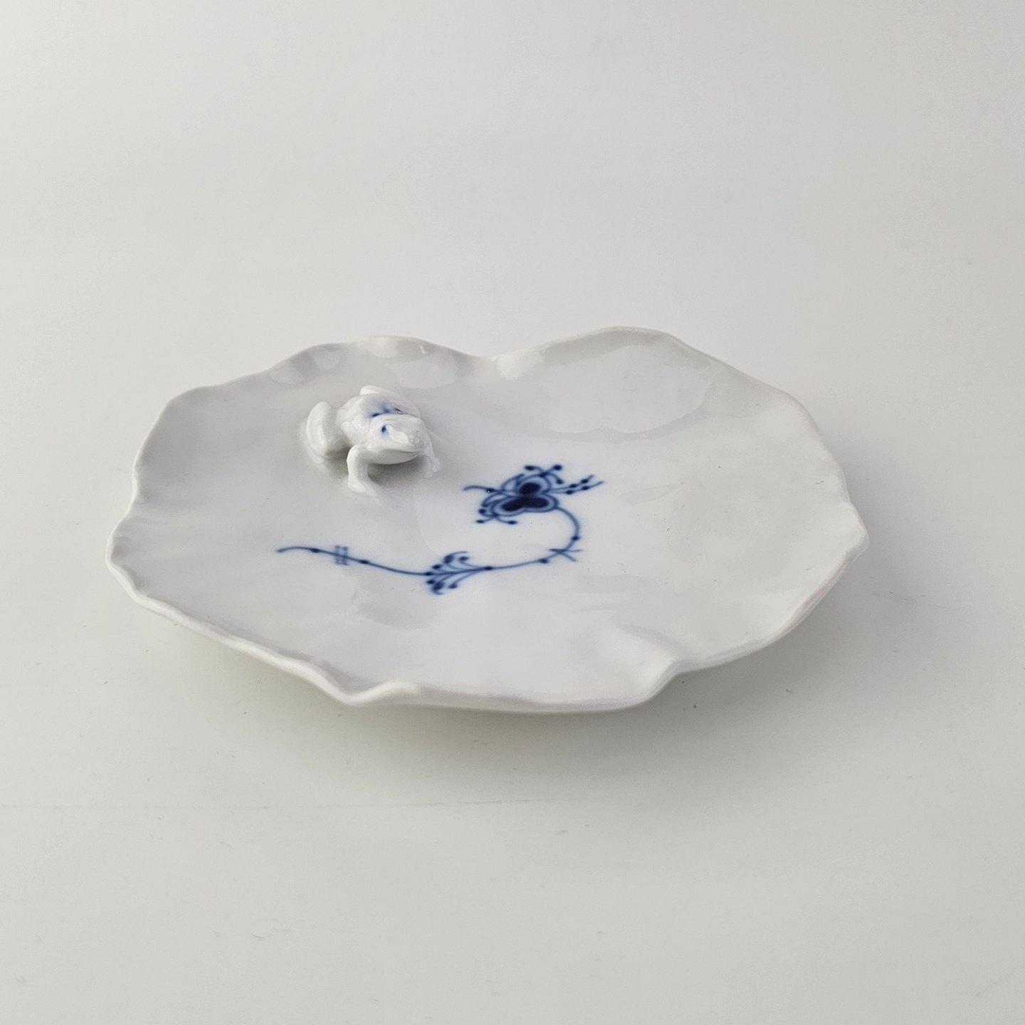 Skål i hvidt kongeligt porcelæn med motiv af en frø på en åkande og musselmalet dekorationNr. 173