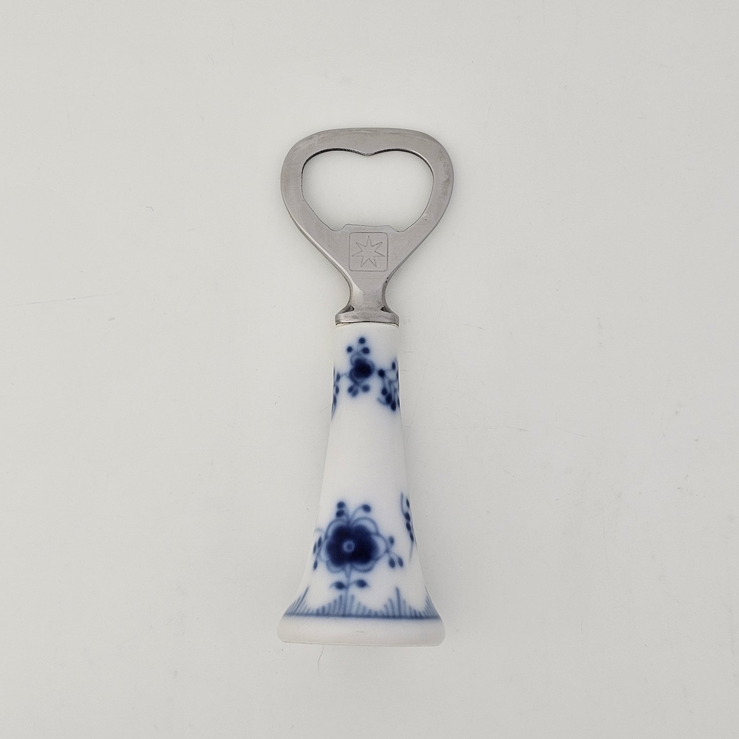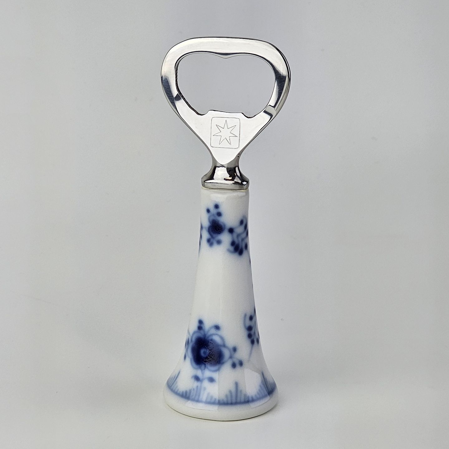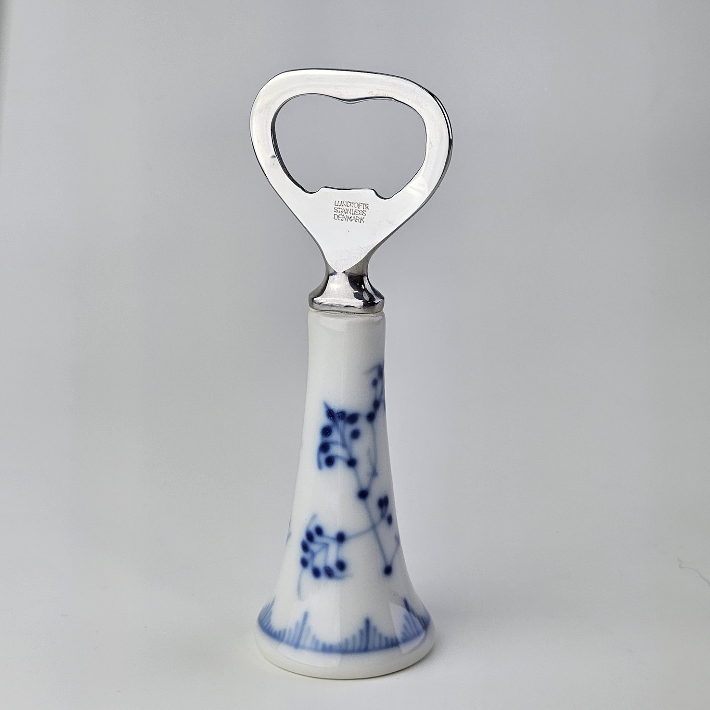 Oplukker i kongeligt porcelæn med hoved i rustfrit stål fra stellet Musselmalet.Nr. 1/2309