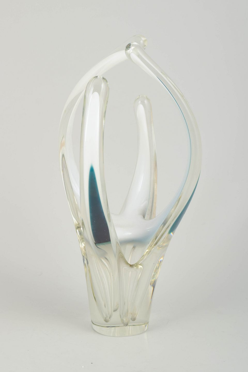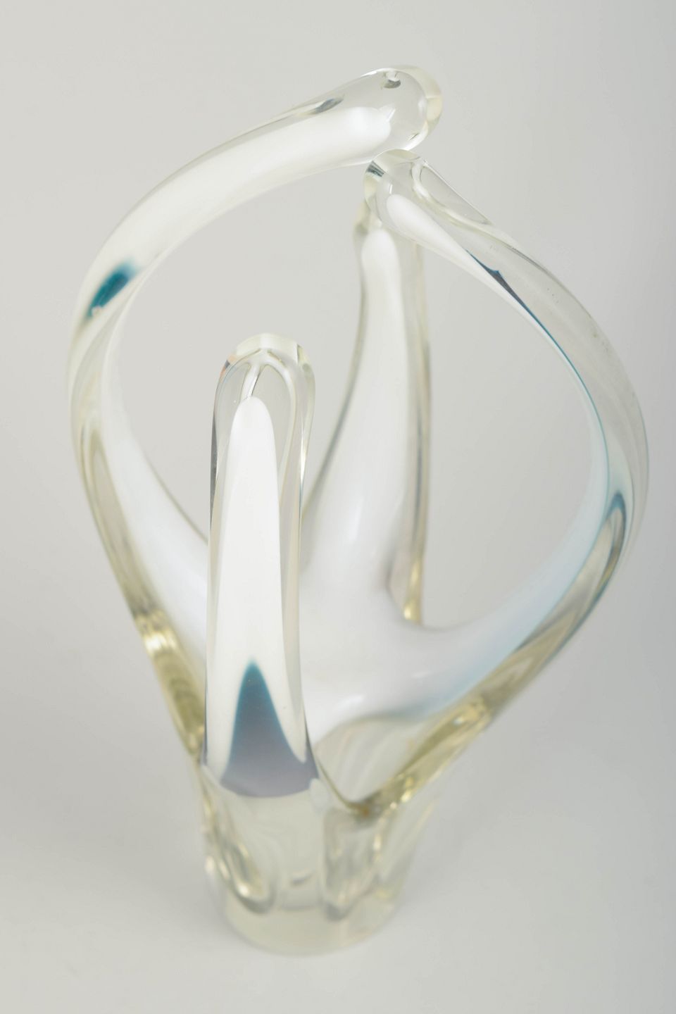 Large, sculptural art-glass vase in clear glass with inner layers of white and deep turquoise/blue. Mouth-blown in a dramatic tall Coquille form with multiple rising flame-like arms, characteristic of Kedelv’s early mid-1950s production.