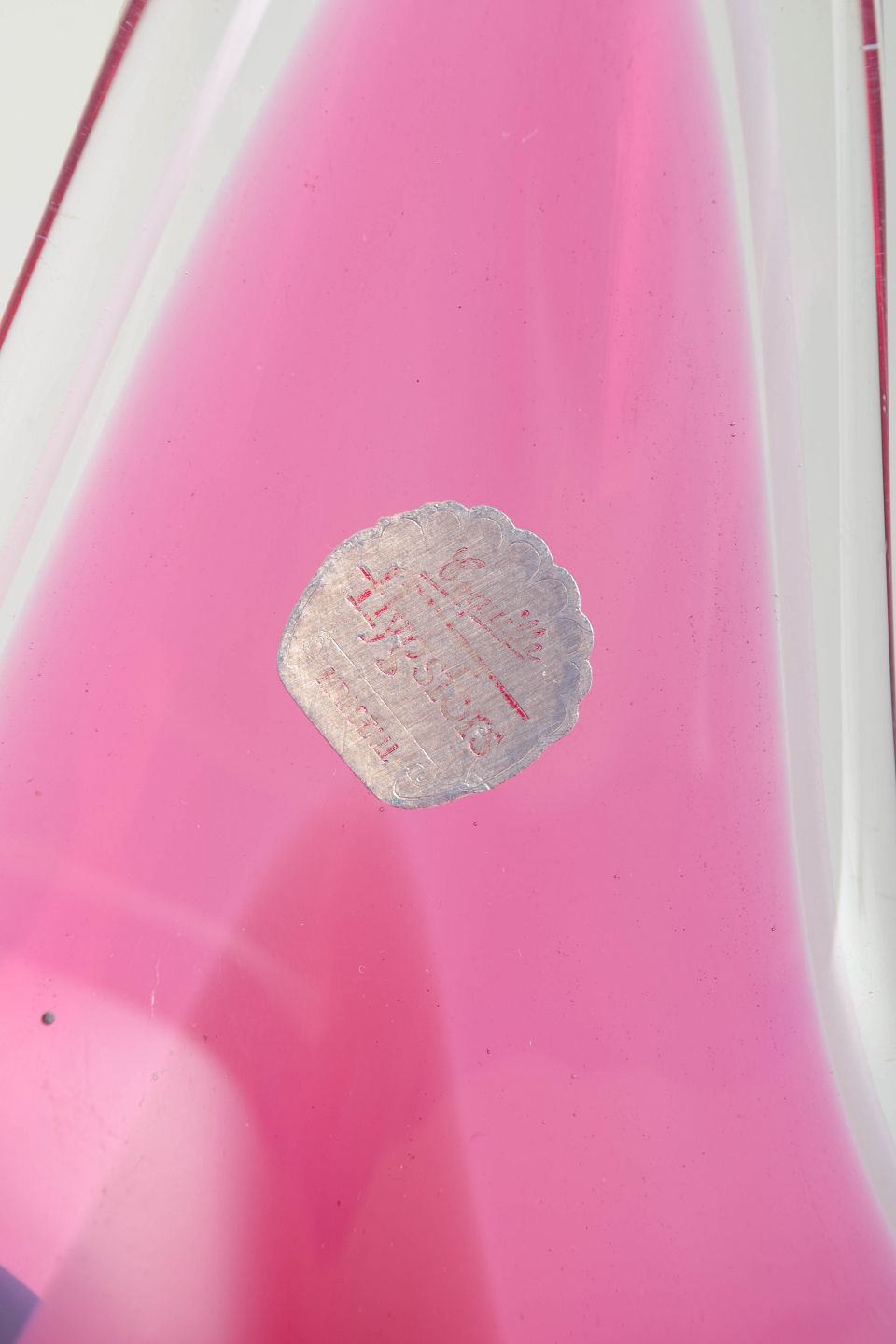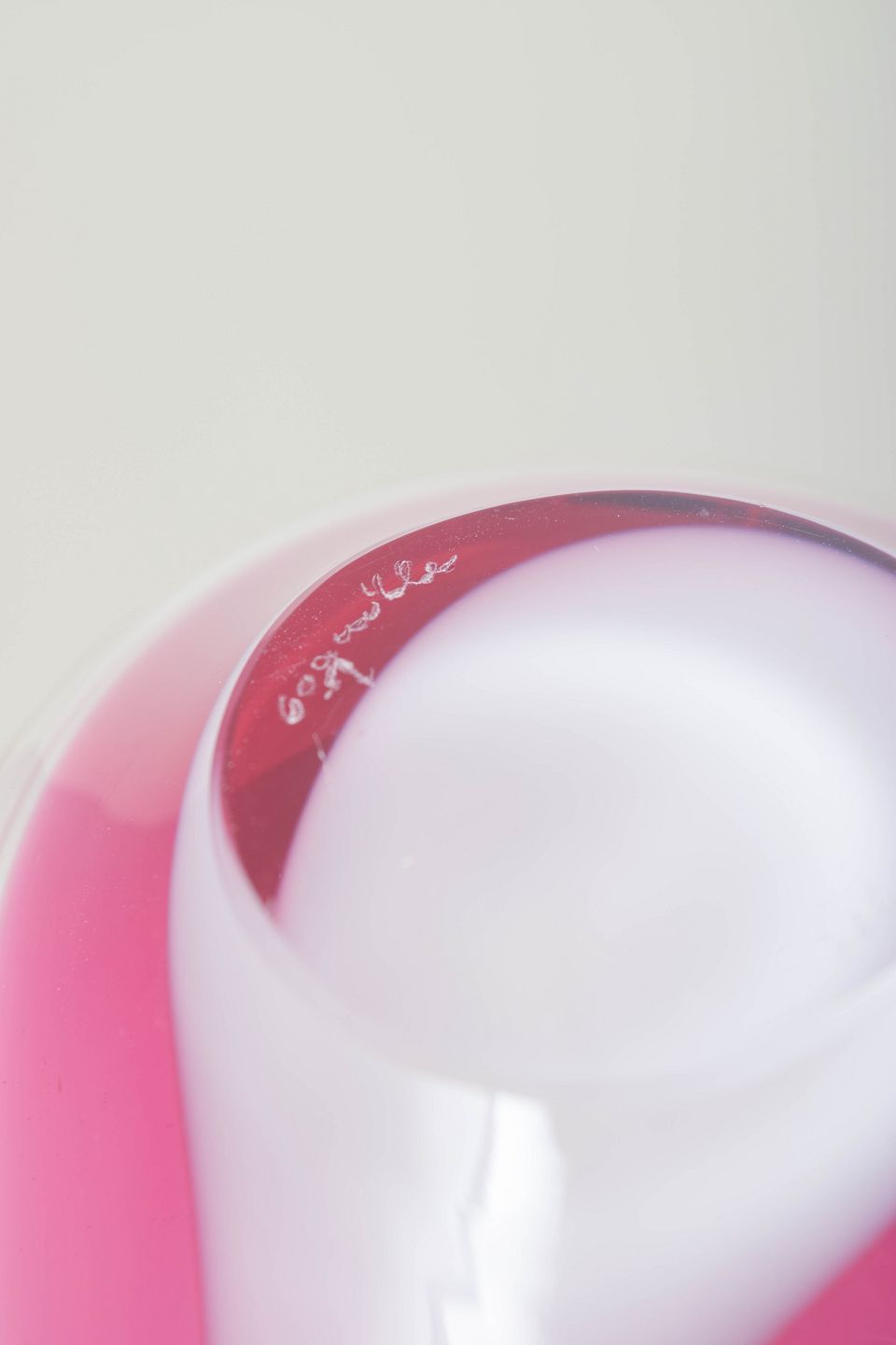 Organic art-glass bowl in clear glass with layered pink and white tones. Mouth-blown with the distinctive asymmetrical sweeping form characteristic of the Coquille series. Retains original Flygfors label. Signed.