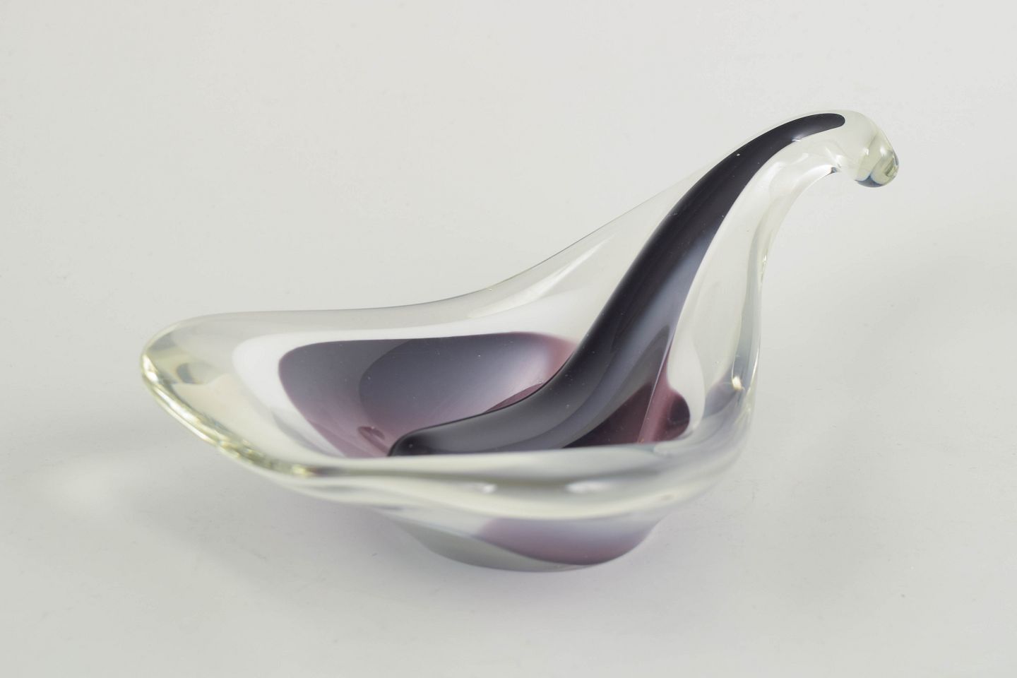 Organically shaped art-glass bowl in clear and violet-toned glass, mouth-blown with the characteristic sweeping form of Kedelv’s celebrated Coquille series.