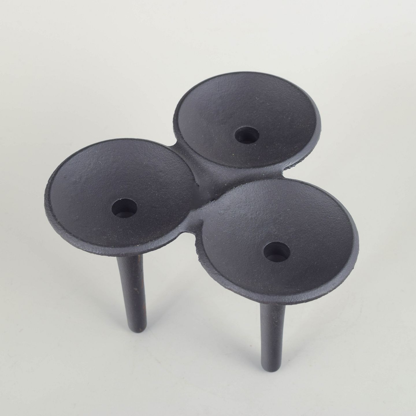 Sculptural, organically shaped candlestick in black-coated cast iron, executed in Quistgaard’s characteristic modernist idiom. The three tapered legs meet at a unified top with three shallow bowl-shaped holders.