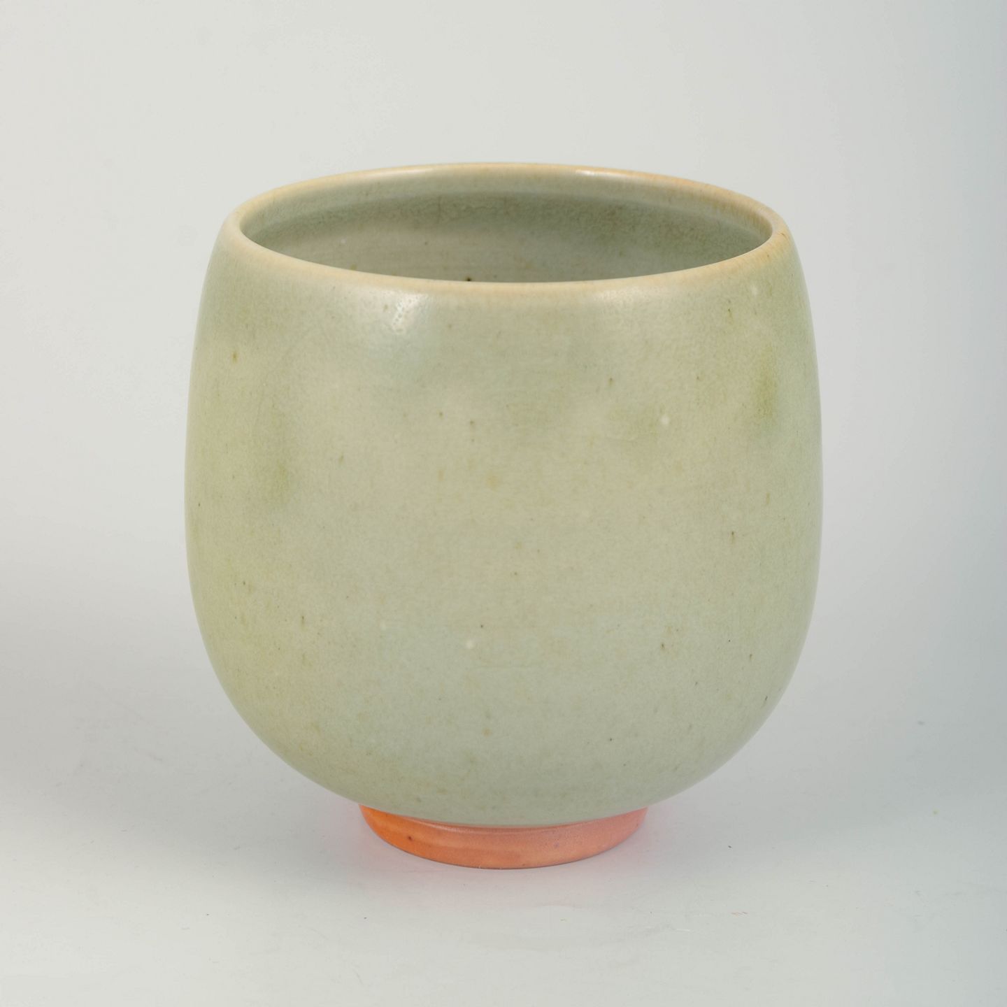 Rolf Palm, Mölle, Sweden – Vase, 1980/90s.Beautiful hand-thrown unique stoneware vase with a softly rounded form, finished in a subdued, green-tinged celadon glaze with a smooth, even surface. The warm terracotta tone at the foot creates a subtle contrast, characteristic of Palm’s simple and material-focused expression. An elegant example of his more minimal studio work from the period.