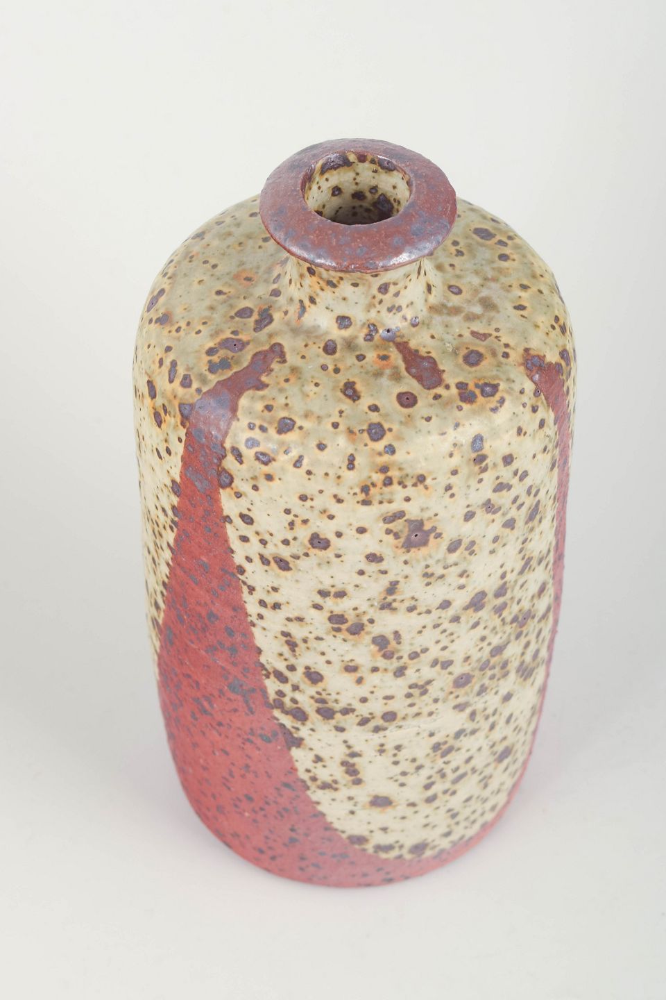 Rolf Palm, Mölle – Large unique vase, 1960/70sImpressive hand-thrown stoneware vase by Rolf Palm, produced in his studio in Mölle. Cylindrical shape with a slightly tapered neck and a distinctive, heavily textured surface. The glaze is typical of Palm: a volcanic, tactile expression in cream, red and brown tones.
