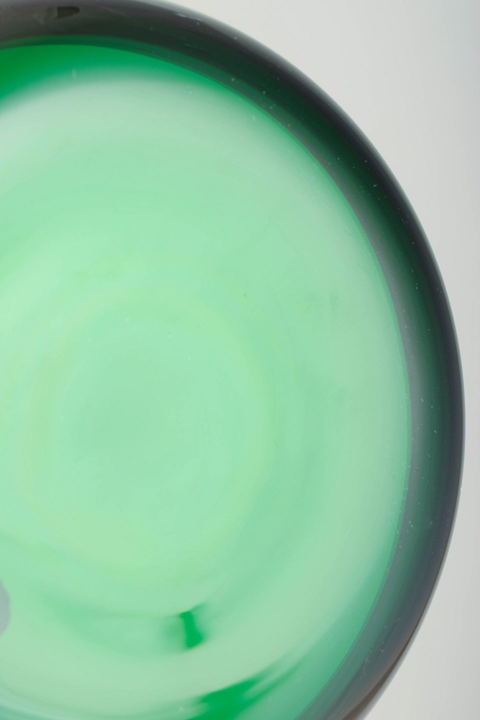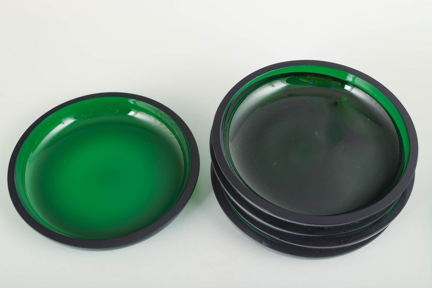 Beautiful plates in deep emerald-green art glass with swirling organic colour play and a thicker dark rim. A decorative and rare set from Svenskt Tenn, characteristic of Josef Frank’s playful and colourful design language.