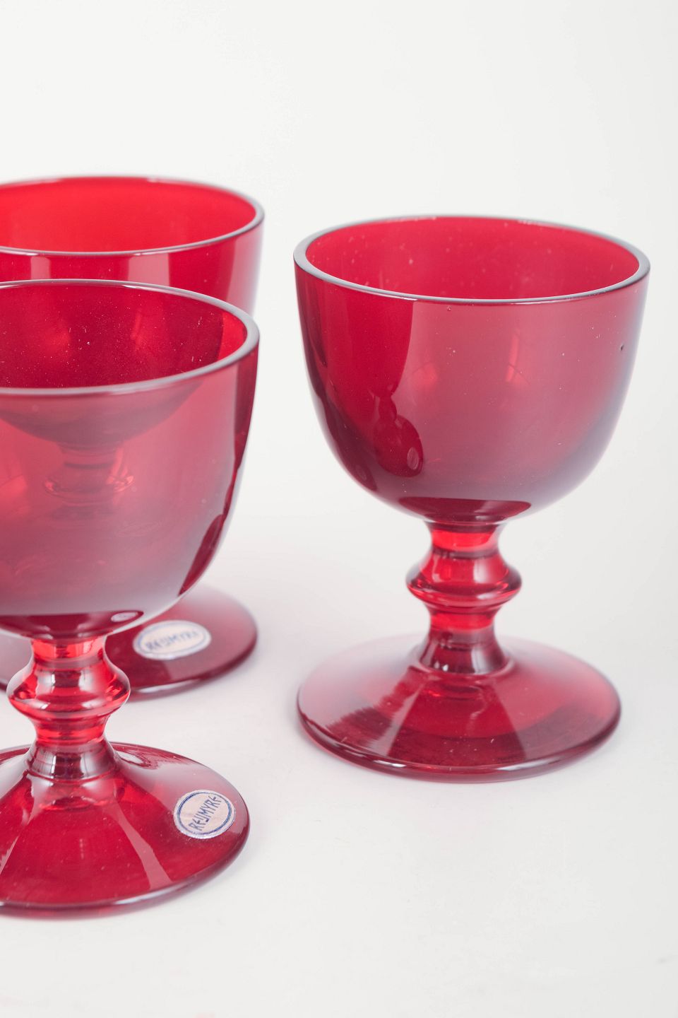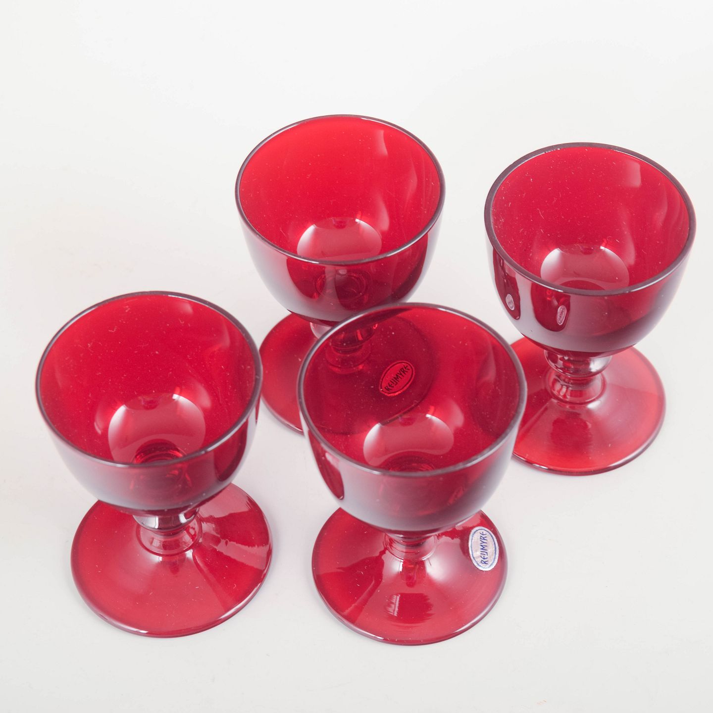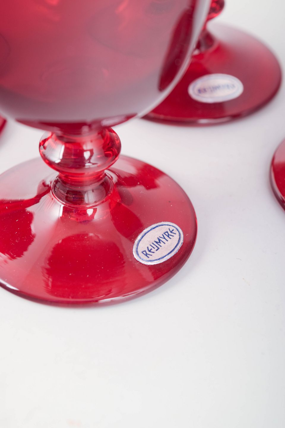 Set of four ruby-red port wine glasses with rounded bowls and profiled stems. One glass retains the original Reijmyre label.