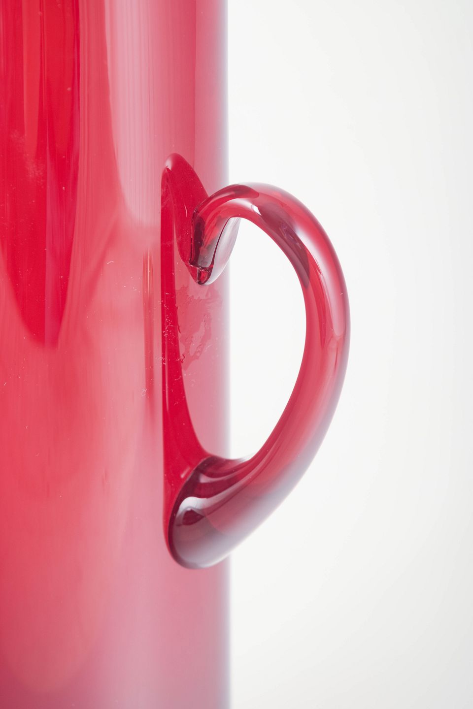 Tall cylindrical art-glass pitcher in deep ruby-red glass with a gracefully curved handle and small pouring spout. With original Reijmyre label.