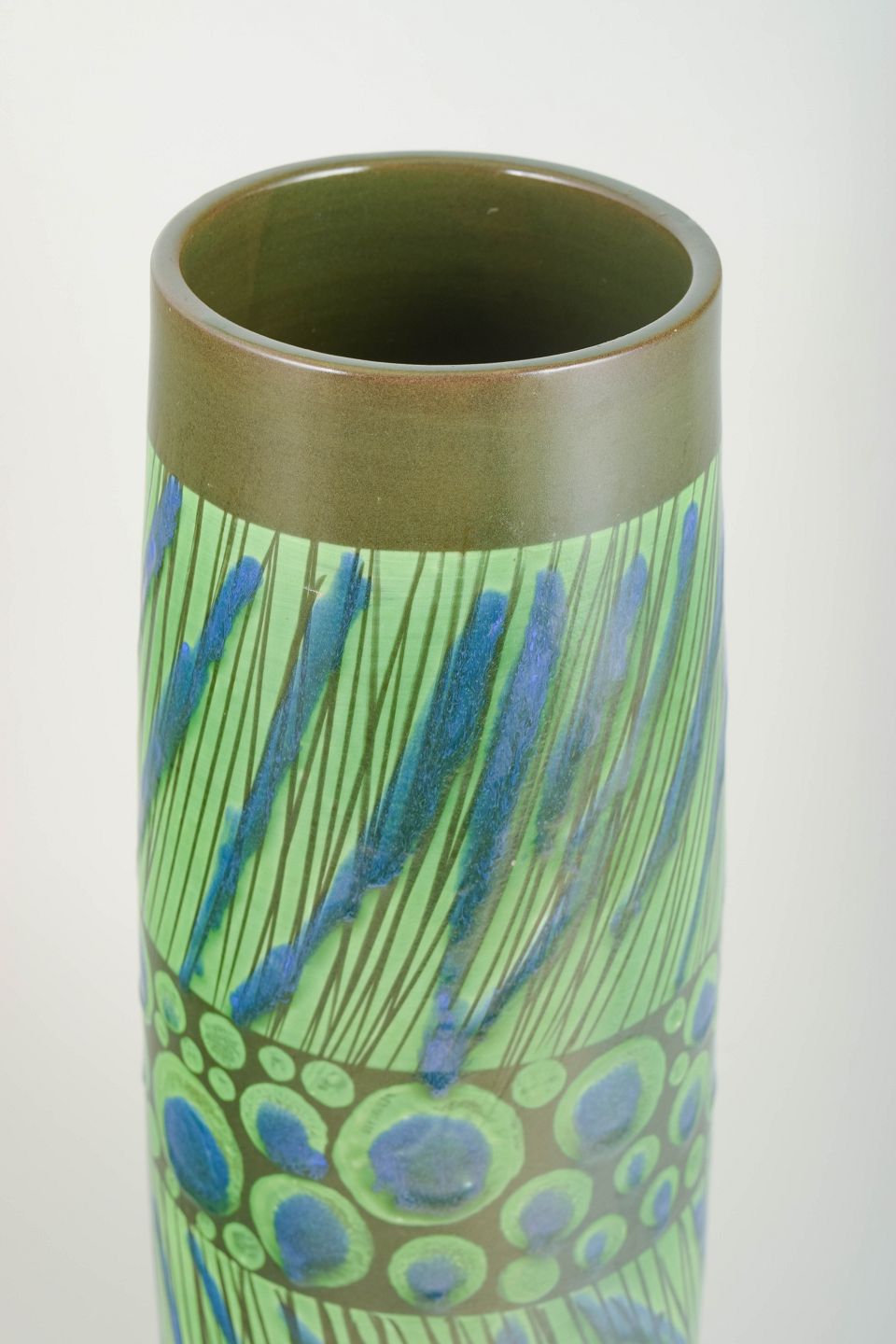 Rare and monumental ceramic vase by Göran Andersson for Upsala-Ekeby, created in the 1960s. Cylindrical form with vivid hand-painted decoration in green and blue tones, featuring a distinctive band of concentric relief circles. A unique piece from the period – exceptional in both size and artistic expression.