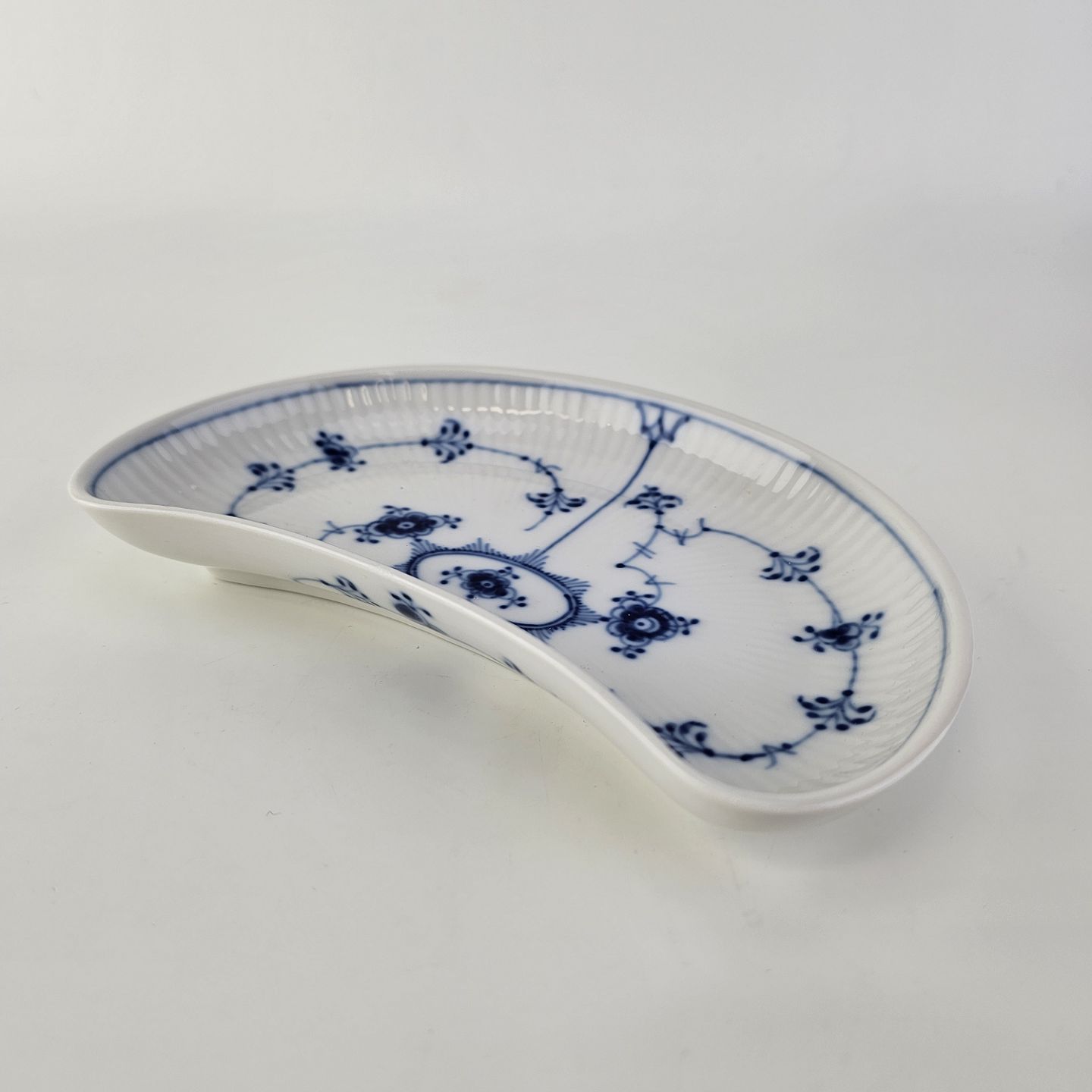 Halvmåneformet fad i kongeligt porcelæn fra stellet Musselmalet HalvblondeNr. 1/154
