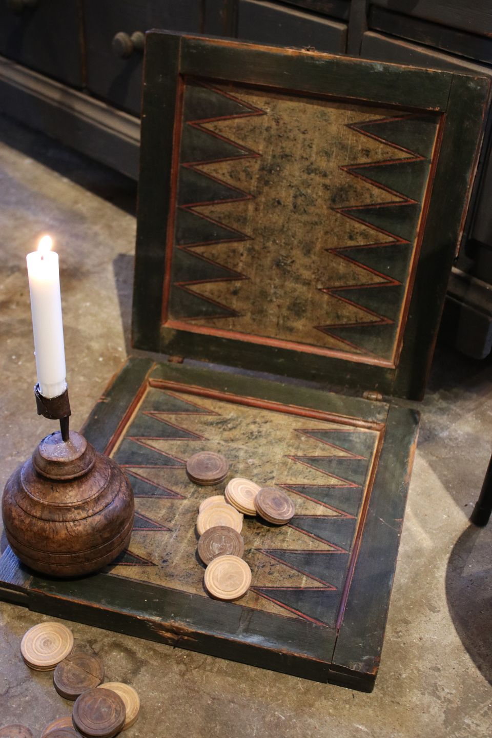 Charming antique 19th century game box / board game in painted wood with 3 different games. Has a super nice patina.The box measures H: 6cm. 36x35cm. (incl. 30 pieces of game pieces)