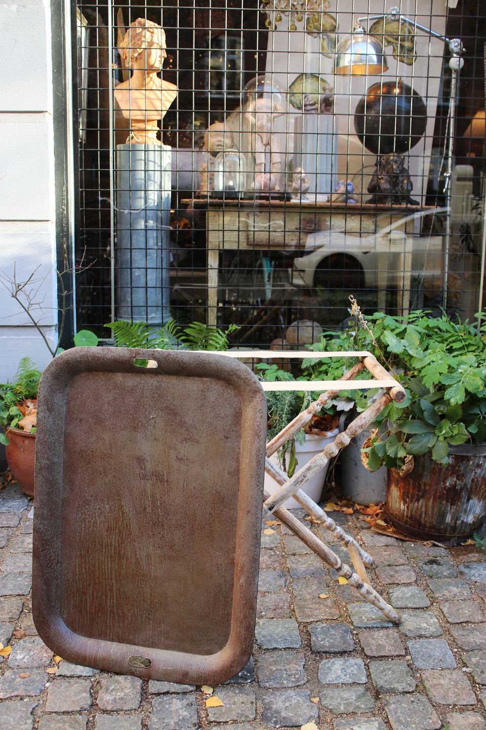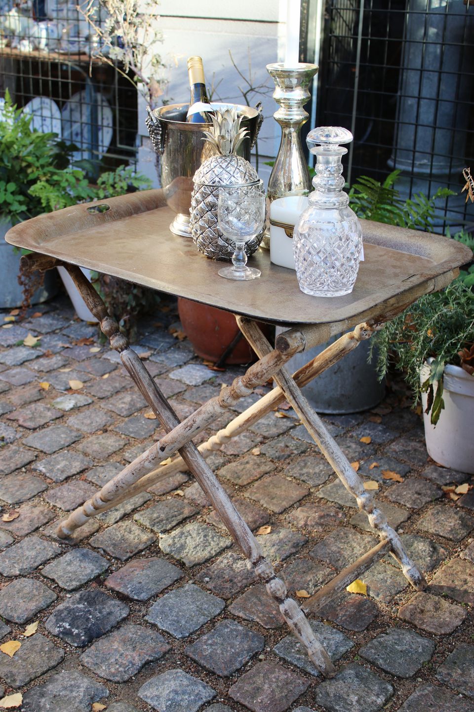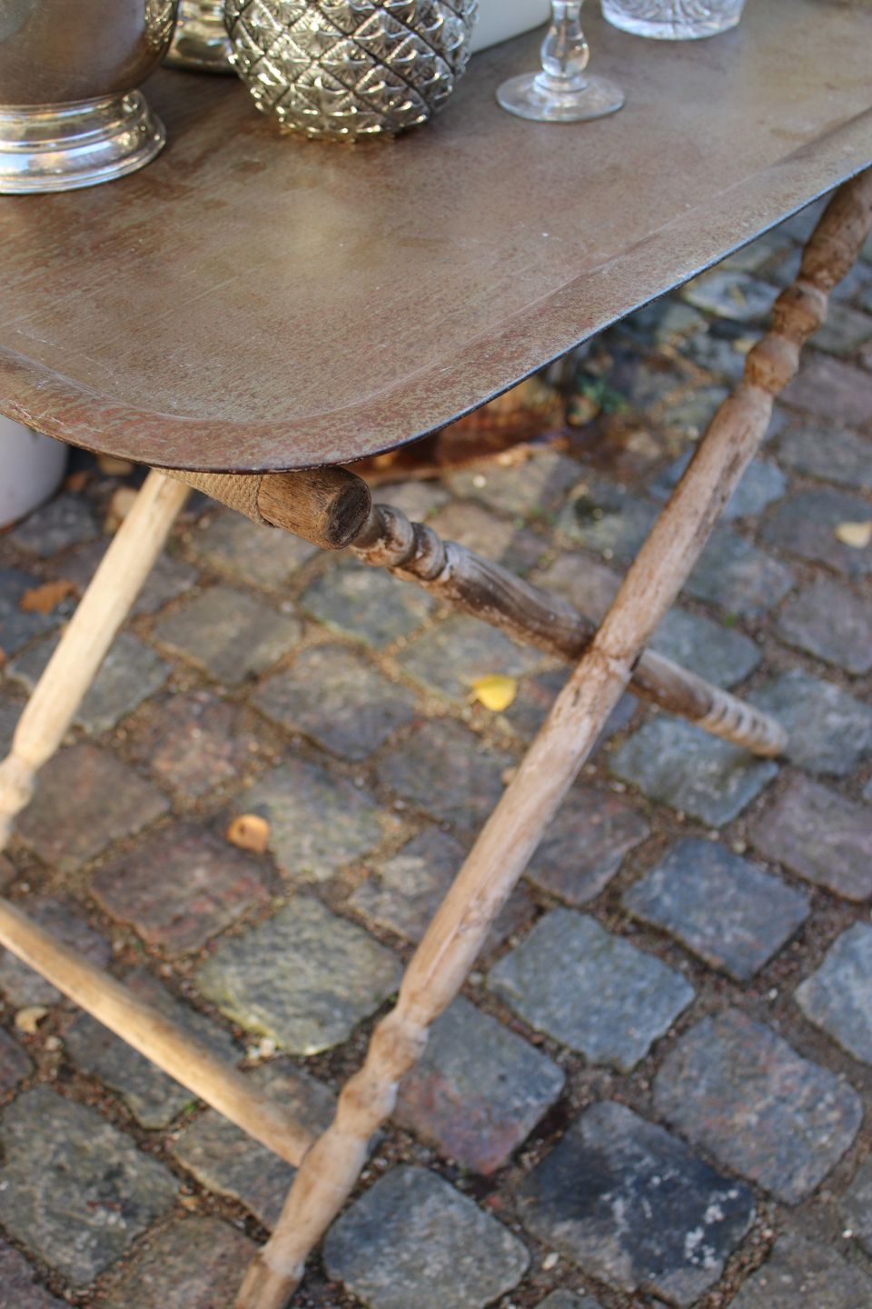Old tray table with wooden base with a really nice patina and large raw metal tray on top. H: 68cm. L&W: 76.55.5cm.Great as a bar table or relief table. Can be folded.