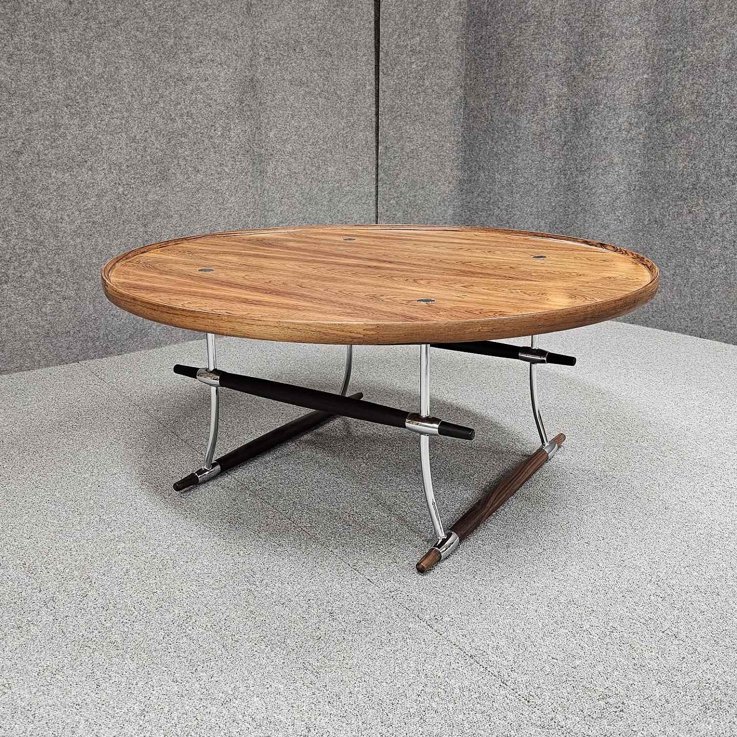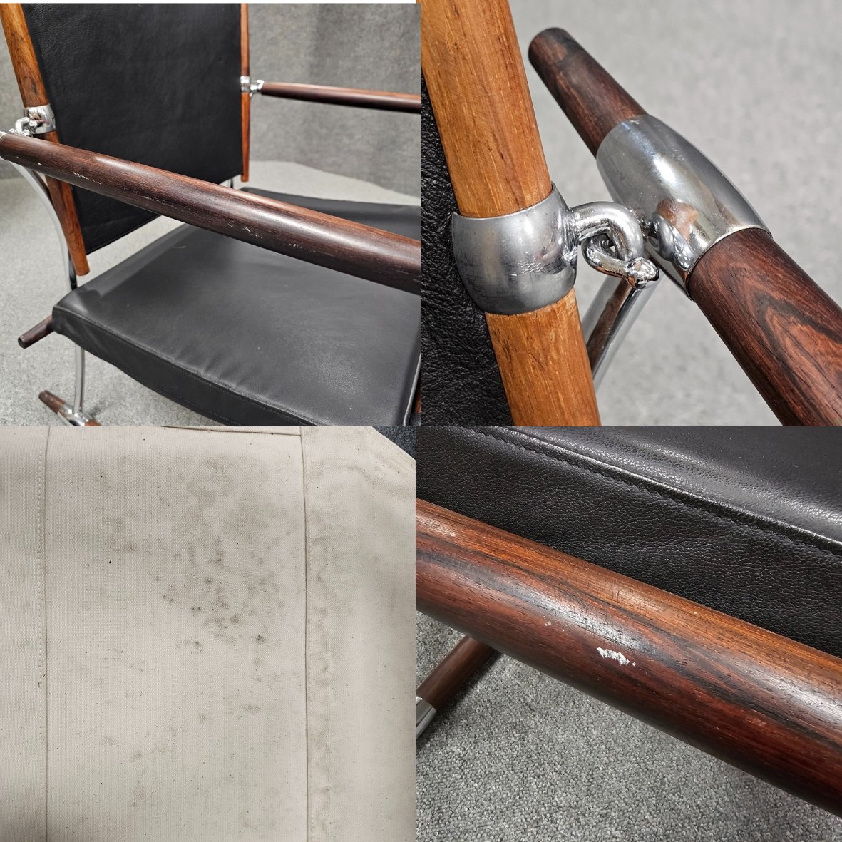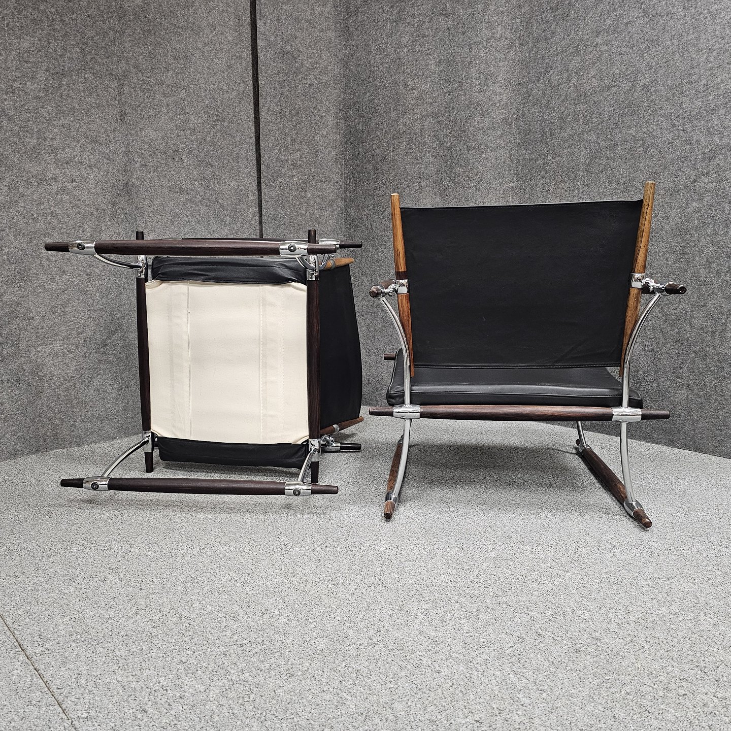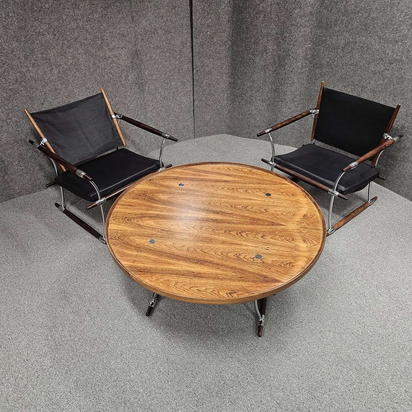 Sæt af to stokkestole med stel i palisander og forkromet stål og sæde af sort læder.Stokkebord ligeledes med stel i palisander og forkromet stål og med bordplade af palisander.