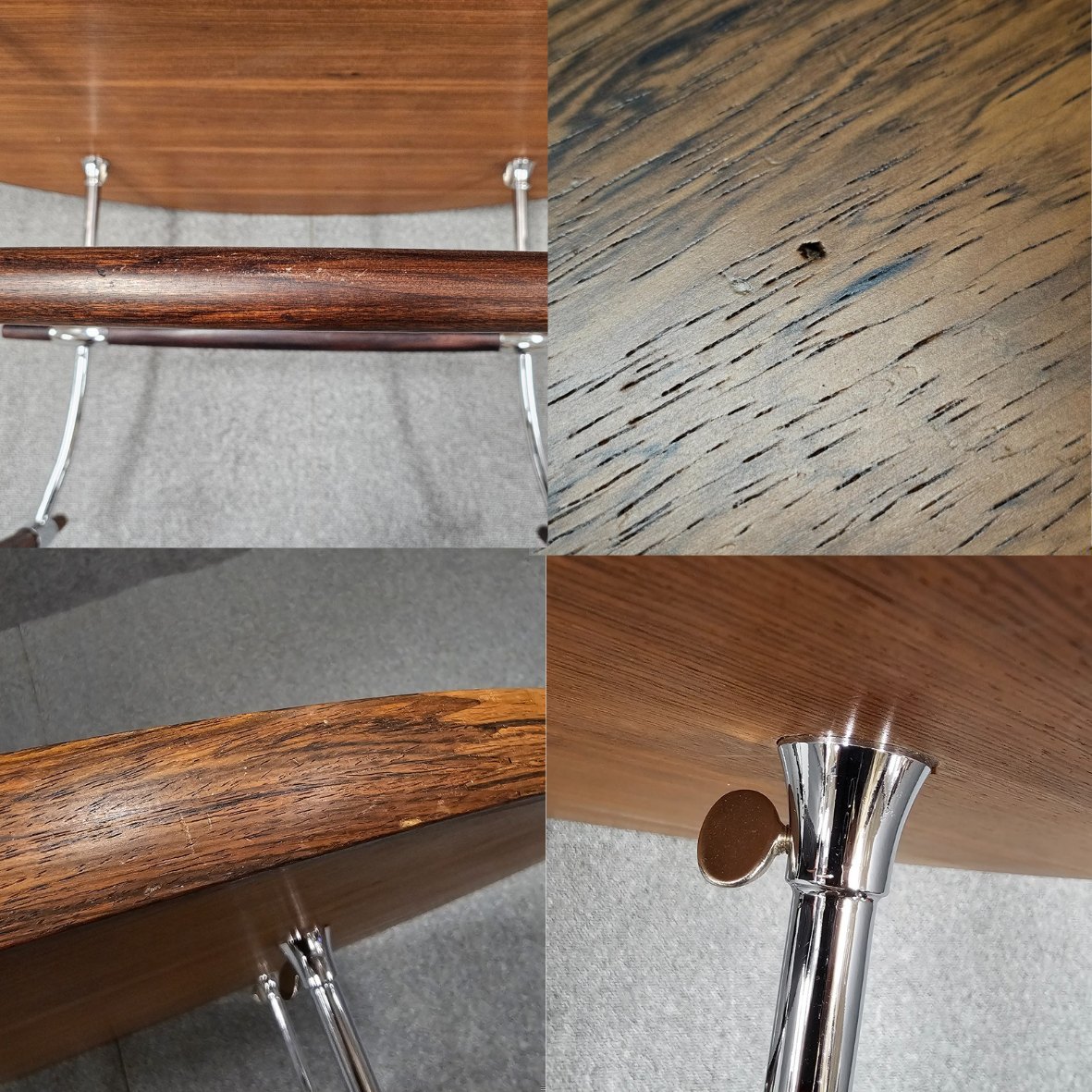 Der er brugsspor på sættet. Stolene har skrammer på stellet og vandskader, og den ene stol har tegn efter skimmel på sædet under hynden. Bordet har ridser og skrammer på overfladen samt et hul i bordpladen.