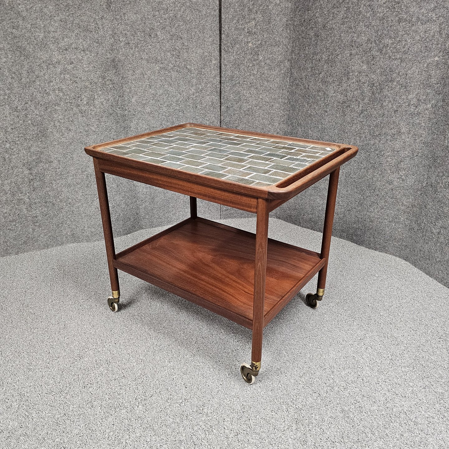 Rullebord i teak dekoreret med kakler i grønlige nuancerDer er brugsspor og slid ved hjulene, som virker fint