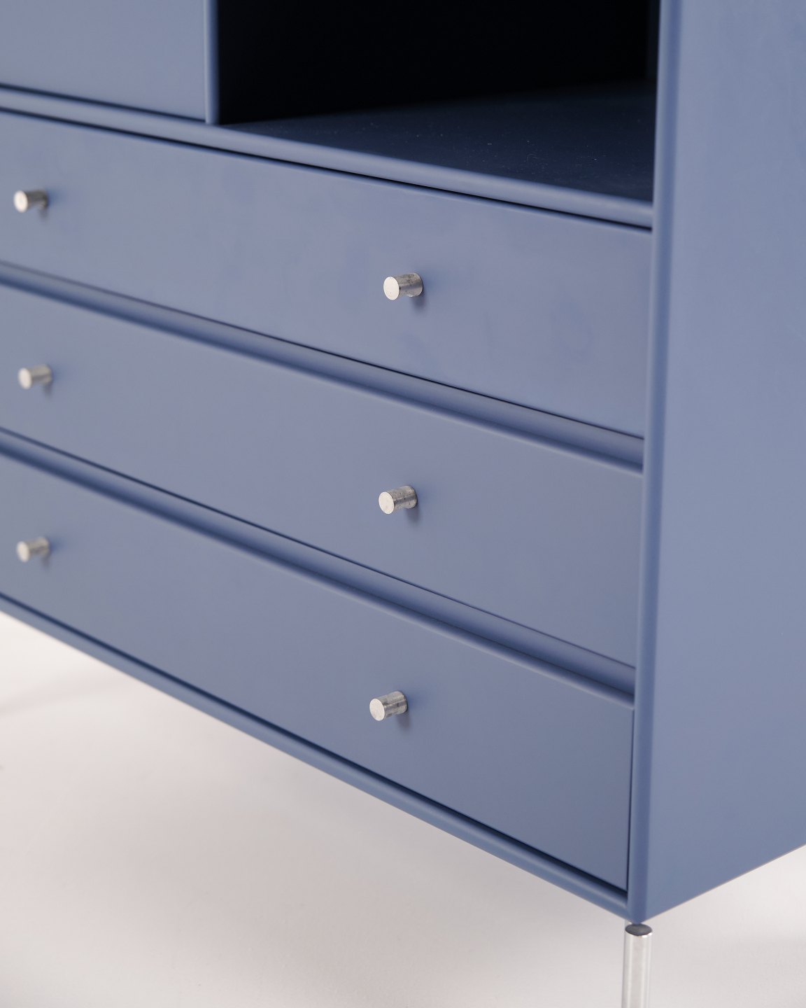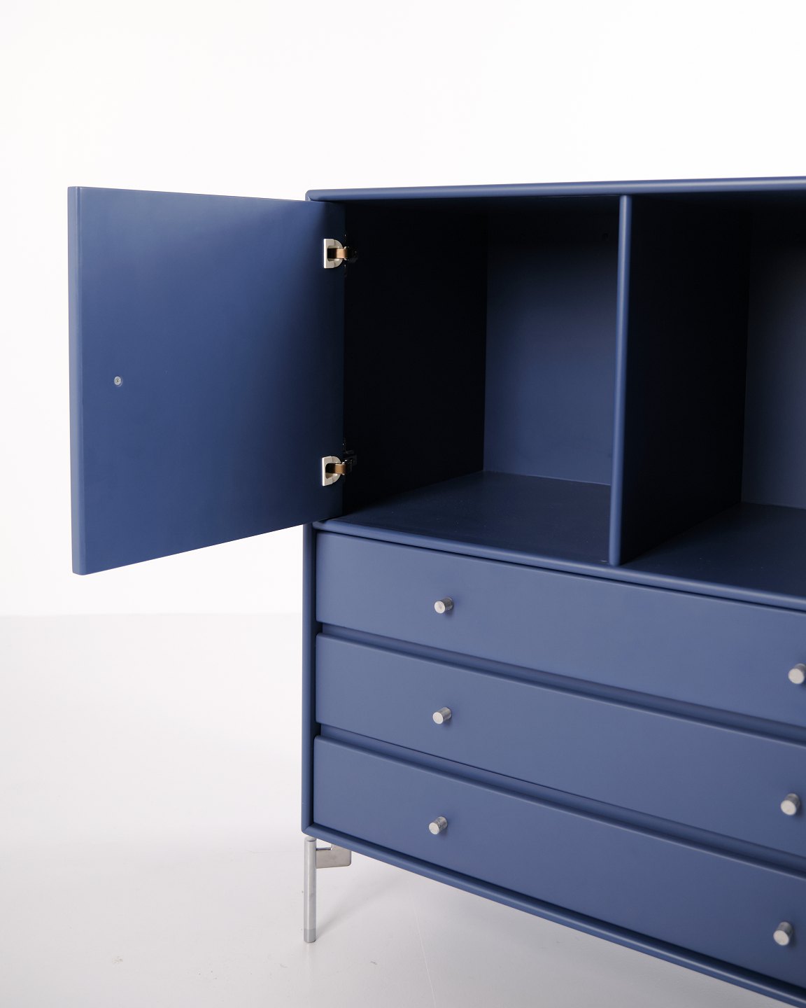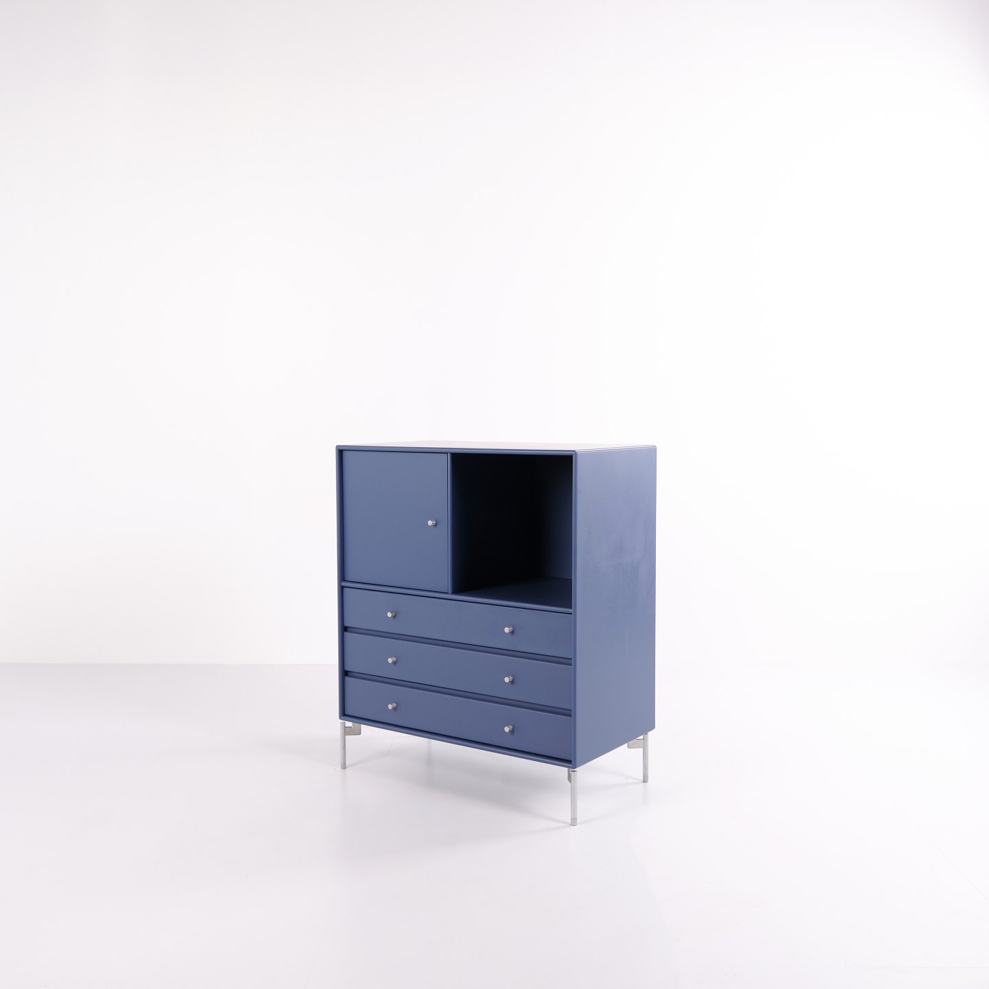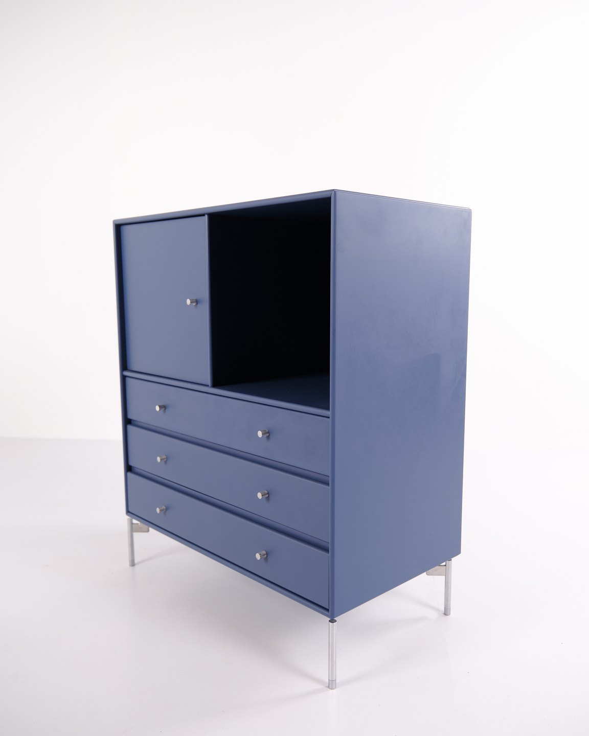 Montana chest of drawers in blue with chrome legs. Designed with three drawers and one door, offering practical and flexible storage. A classic Montana design with clean lines and high functionality.— Manufacturer: Montana