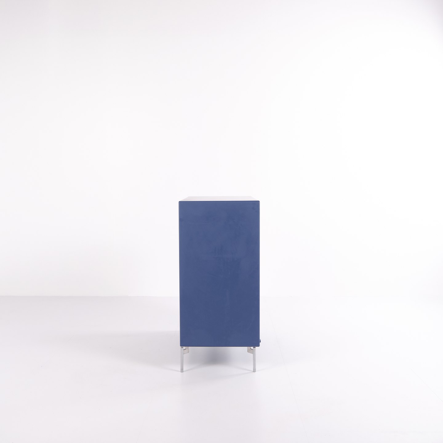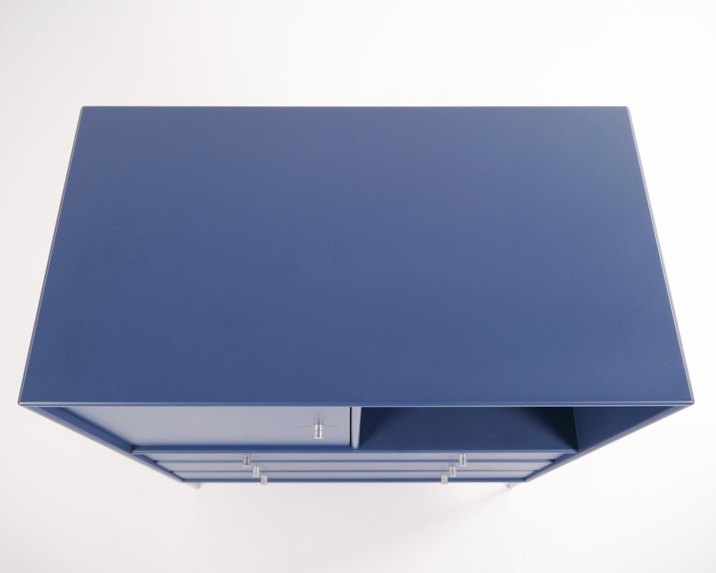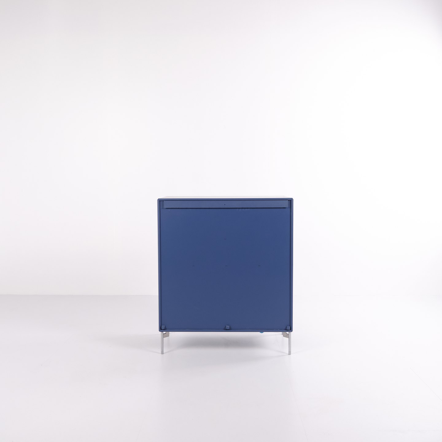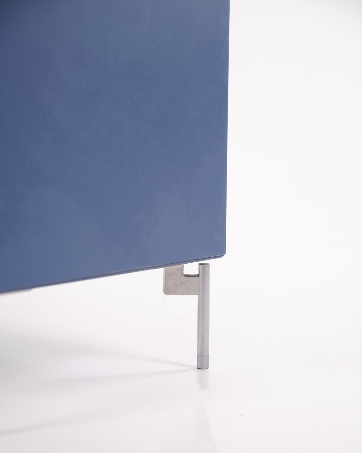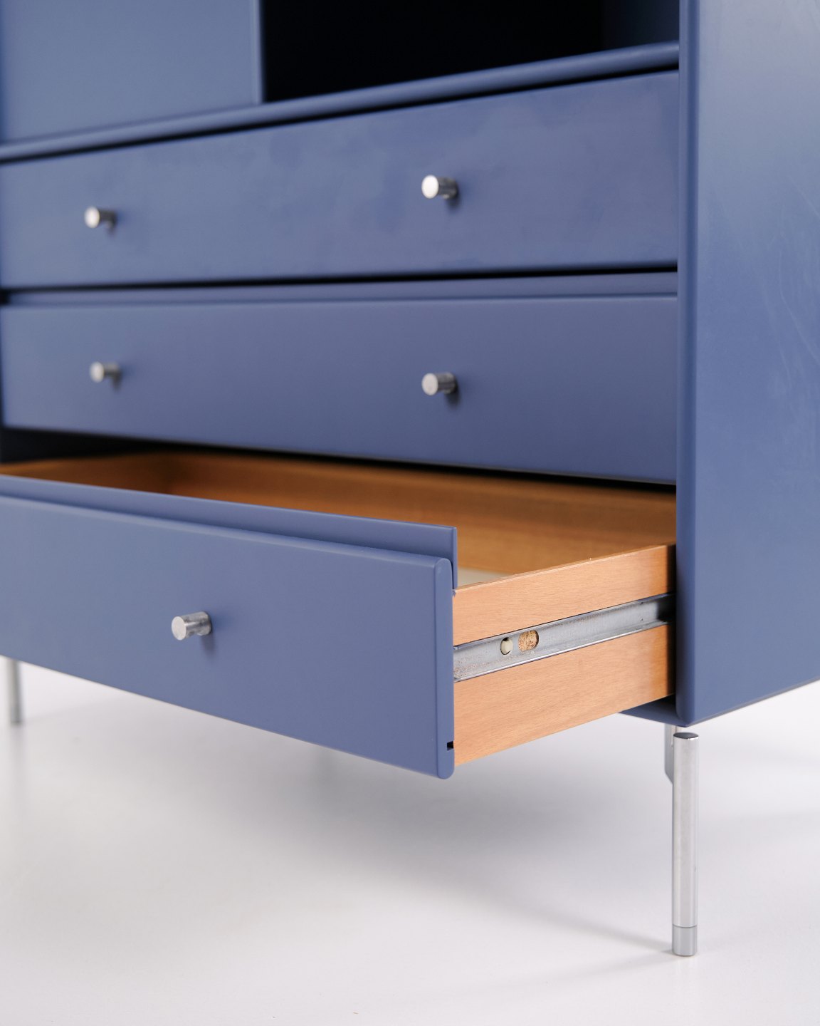 Montana chest of drawers in blue with chrome legs. Designed with three drawers and one door, offering practical and flexible storage. A classic Montana design with clean lines and high functionality.— Manufacturer: Montana