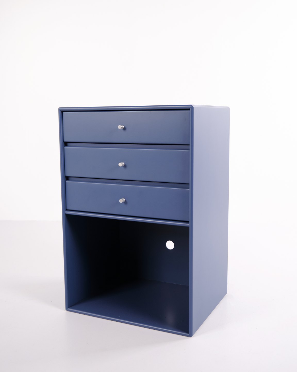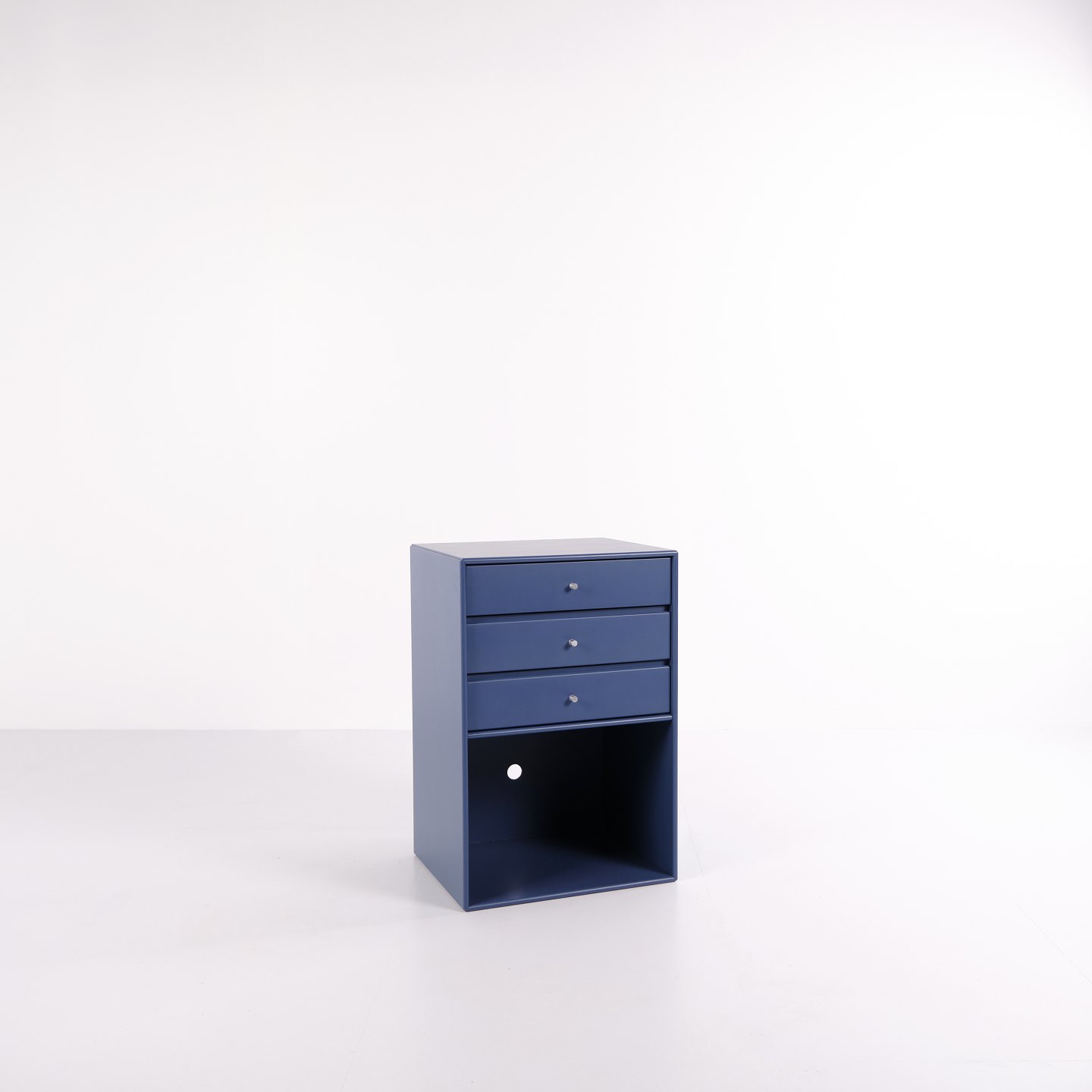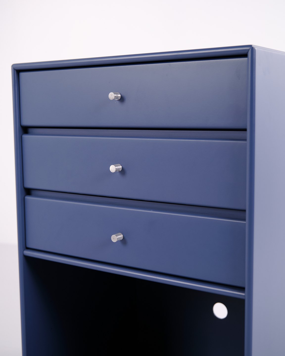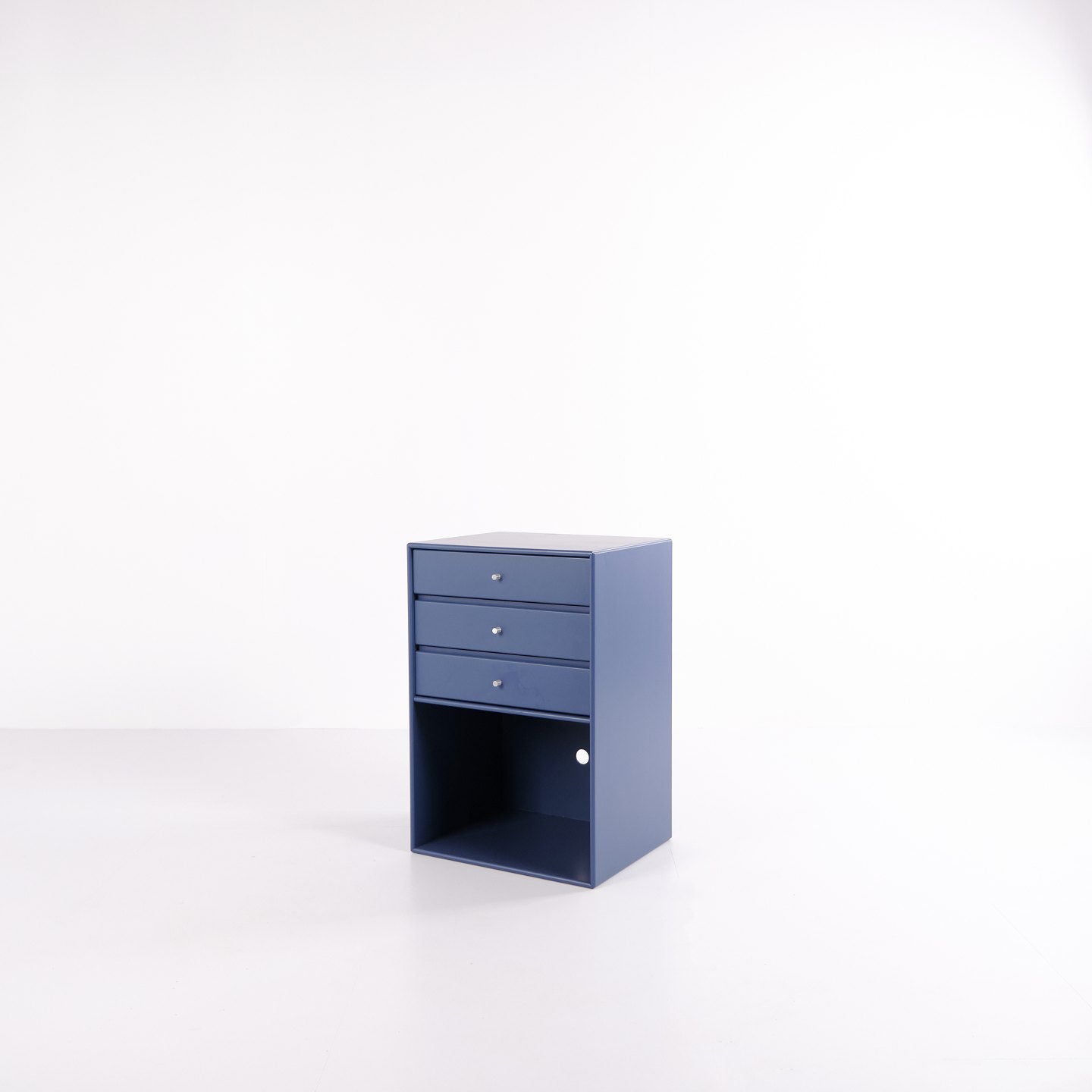 Montana shelf unit in blue with chrome legs. Designed with three drawers and one open shelf, suitable for both storage and display. A classic Montana module combining functionality with a clean, simple design.— Manufacturer: Montana