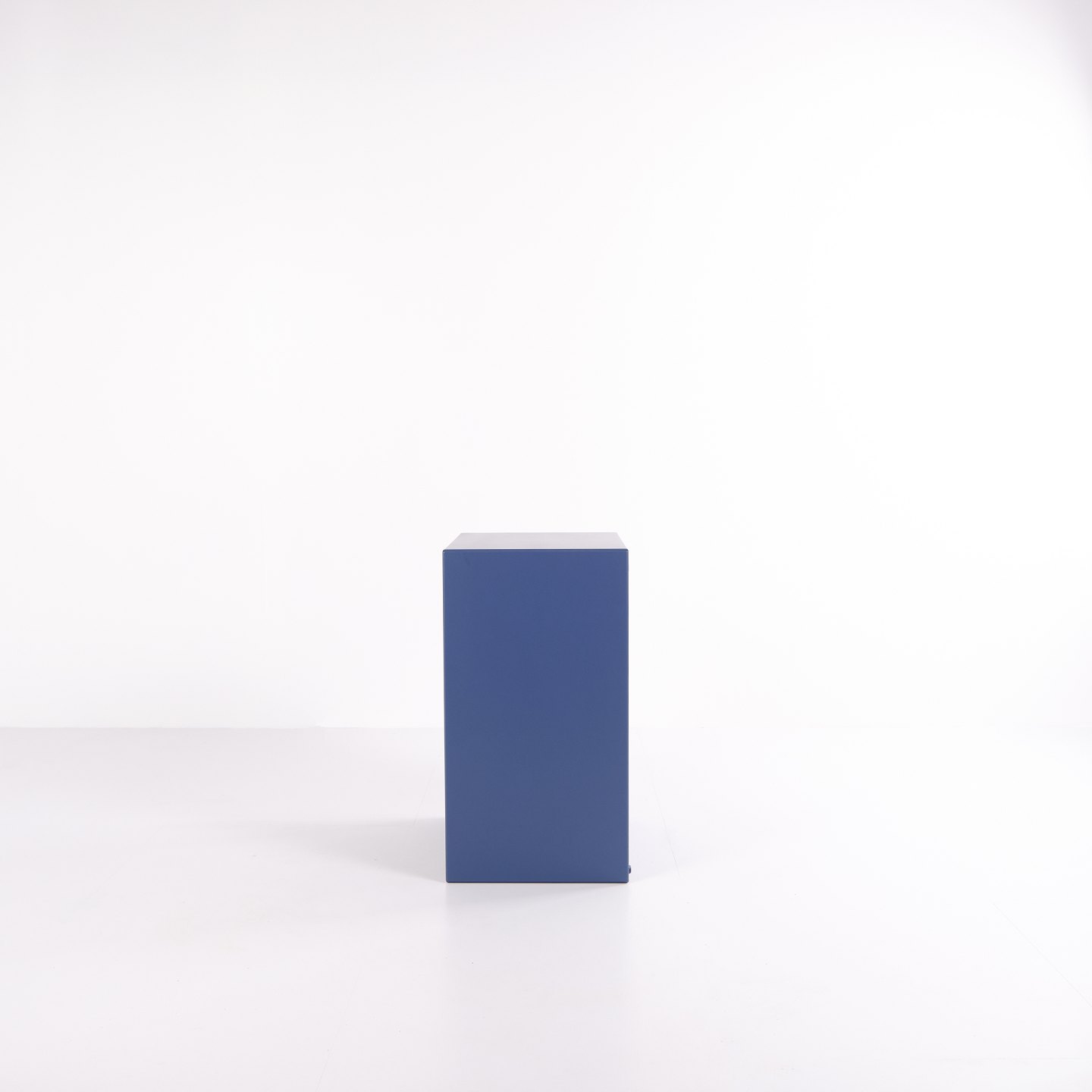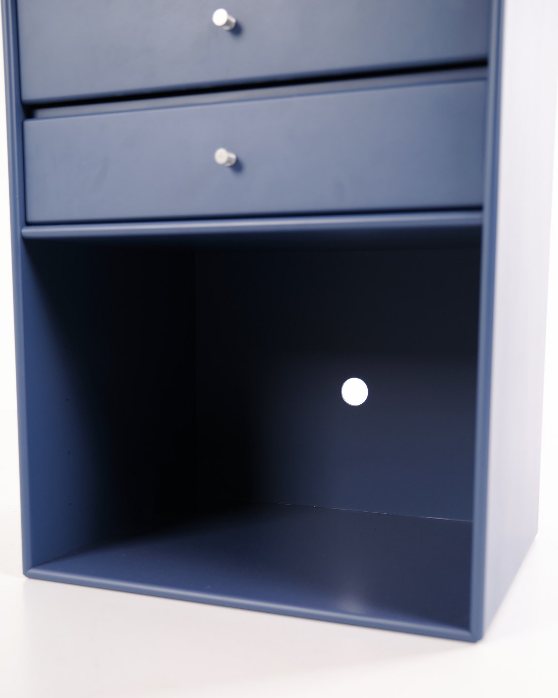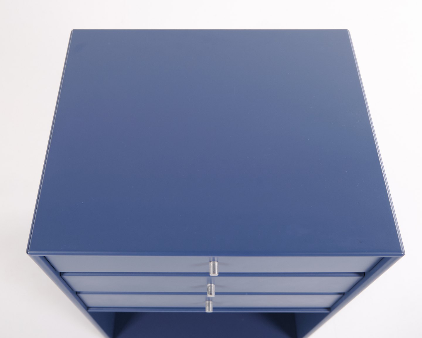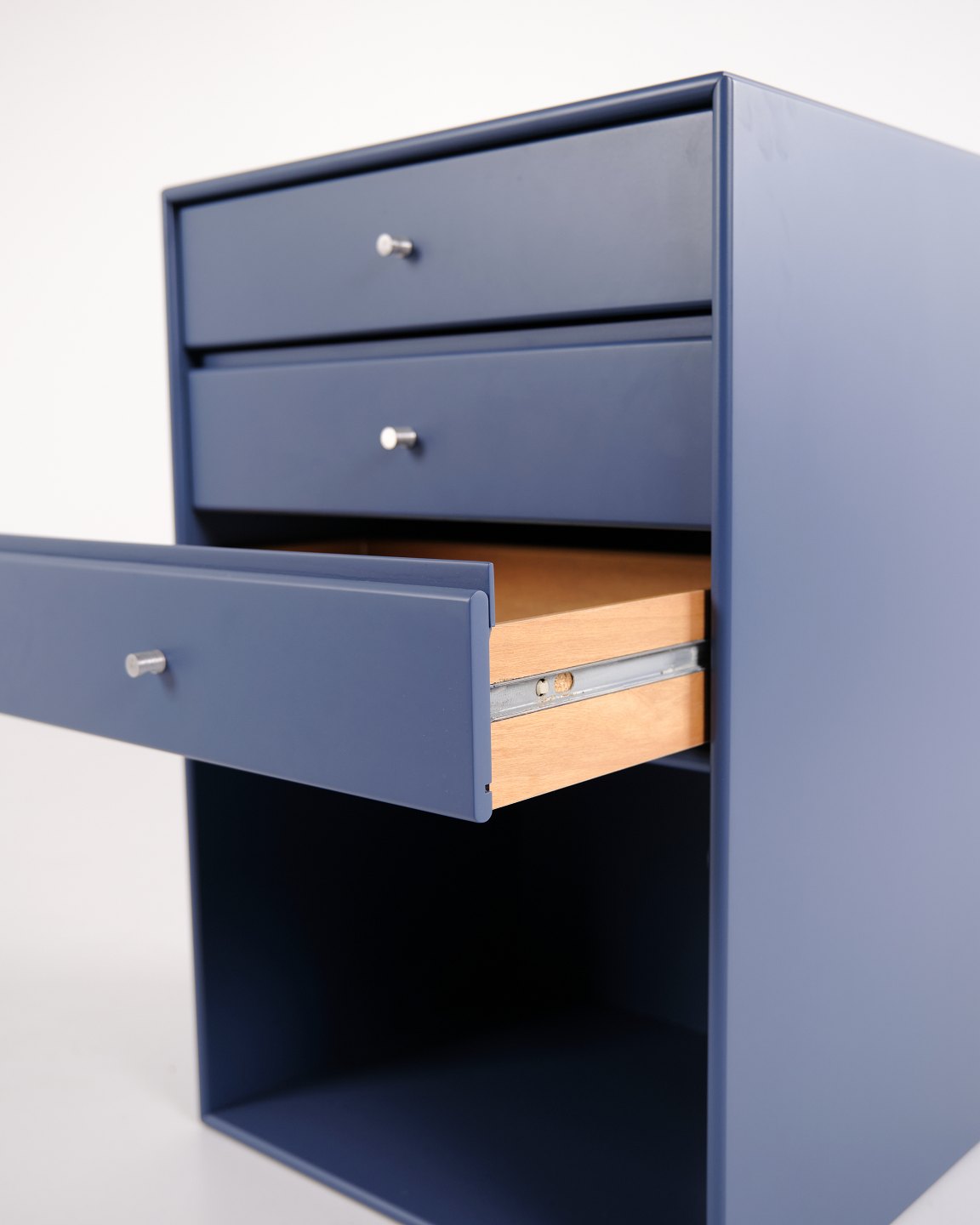 Montana shelf unit in blue with chrome legs. Designed with three drawers and one open shelf, suitable for both storage and display. A classic Montana module combining functionality with a clean, simple design.— Manufacturer: Montana