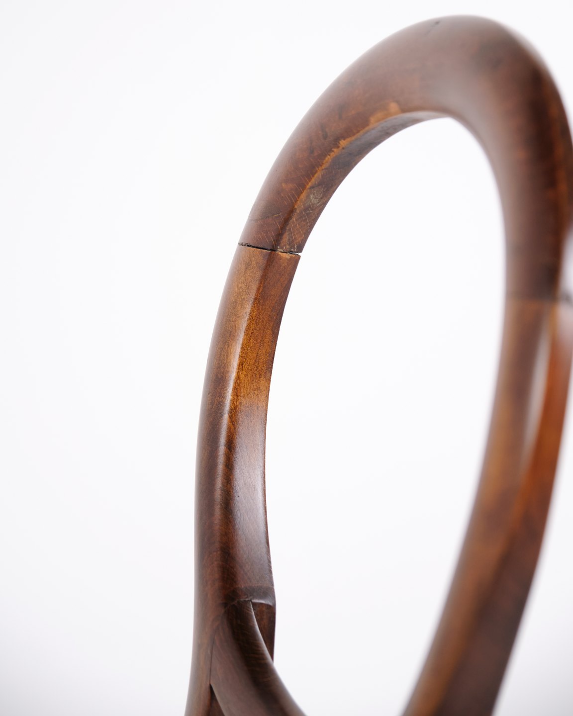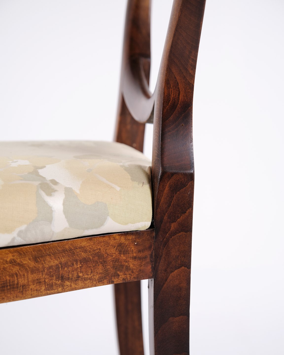Set of four salon/dining chairs from the 1860s, made of mahogany and upholstered in light floral fabric. Rococo-inspired design with carved details and classic proportions. Elegant chairs for dining rooms, living spaces or hallways.— Origin: Europe