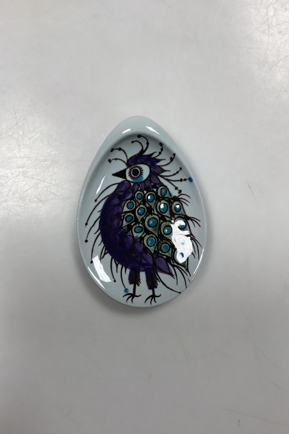 Aluminia Faience Tenera Smal Dish / Side Plate No. 107/1355. Motif: Bird in purple and blue. Designed by Beth Breyen.Measures 9.5 cm x 6.5 cm / 3.74 in. x 2.55 in.