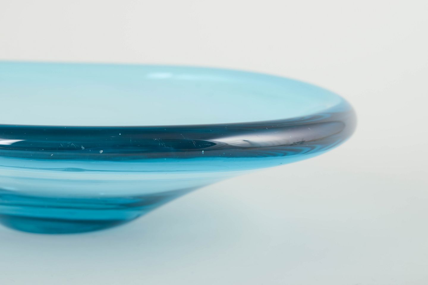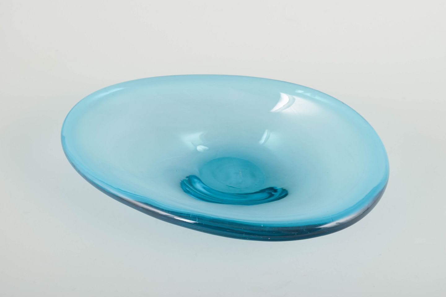 Organically shaped mouth-blown bowl in turquoise blue glass with thick walls and soft flowing contours, typical of Scandinavian glass design of the period.