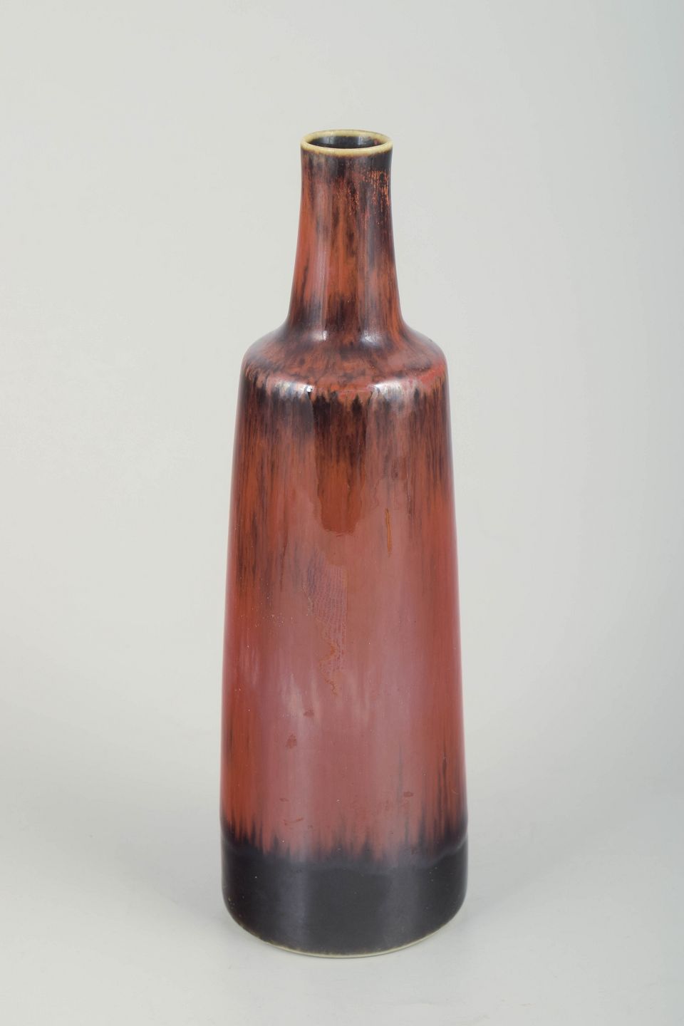 Elegant cylindrical stoneware vase with a narrow neck and characteristic reddish-brown glaze with darker running tones towards the base – a fine example of Stålhane’s refined form language and glaze work.