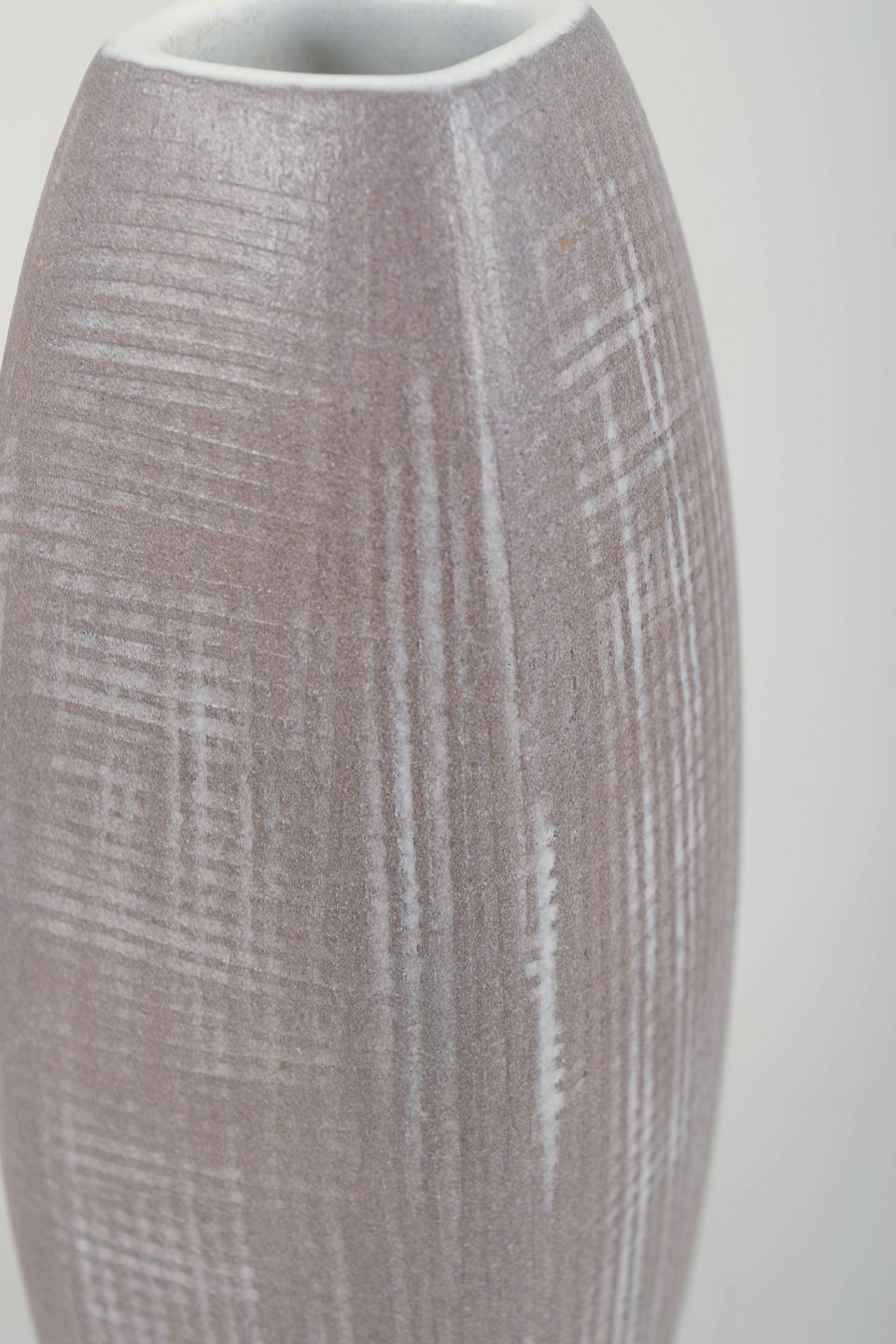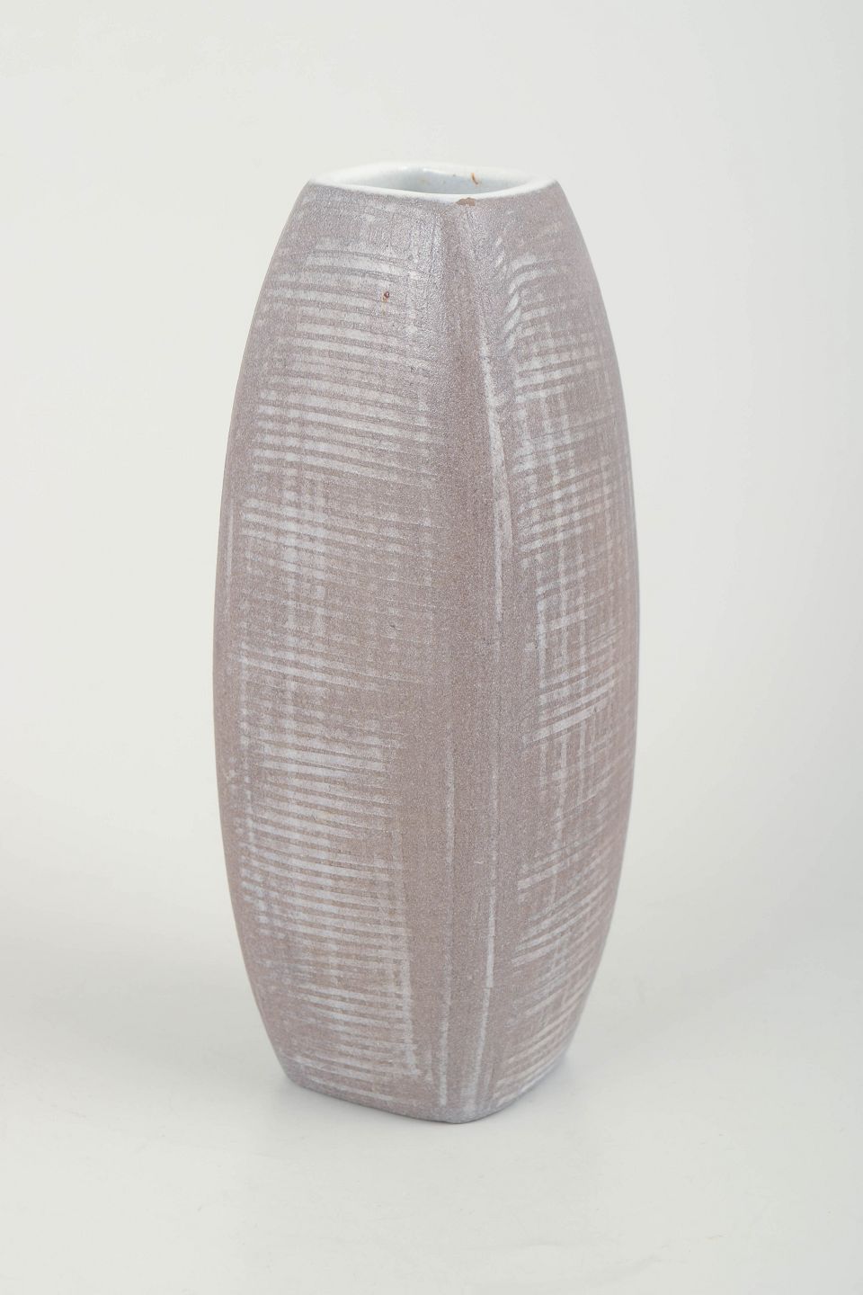 Elegant four-sided stoneware vase with matte pink/lilac glaze and white interior, decorated with characteristic incised linear pattern. Model 2225.