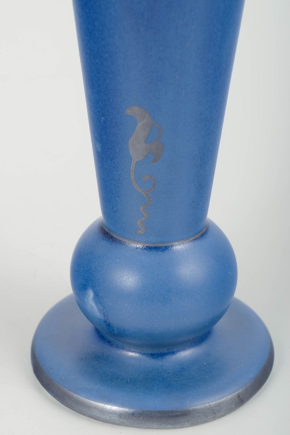 Tall decorative vase in intense blue glaze with a metallic sheen and stylised decorative motif. Sculptural form featuring a pronounced rounded base and tapered body.
