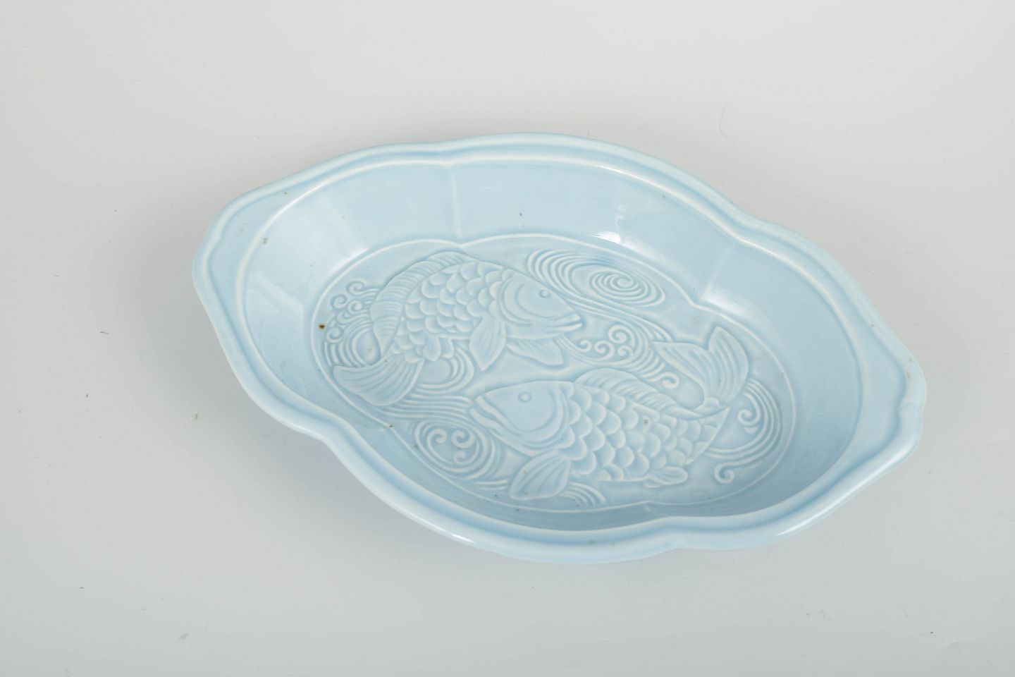 Unique dish in Chinese-inspired style with moulded fish decoration and a light celadon-style blue glaze. Signed.