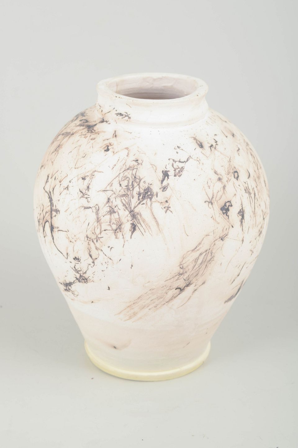 Unique hand-thrown stoneware vase with a light glaze and characteristic marbled decoration in brown and black tones. Organic, classic form with broad shoulders and a narrow neck. Signed.
