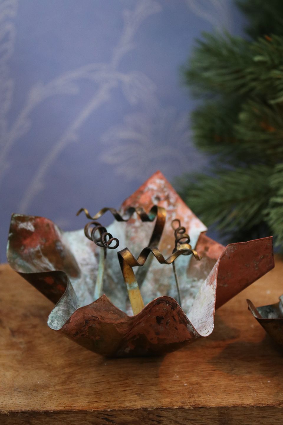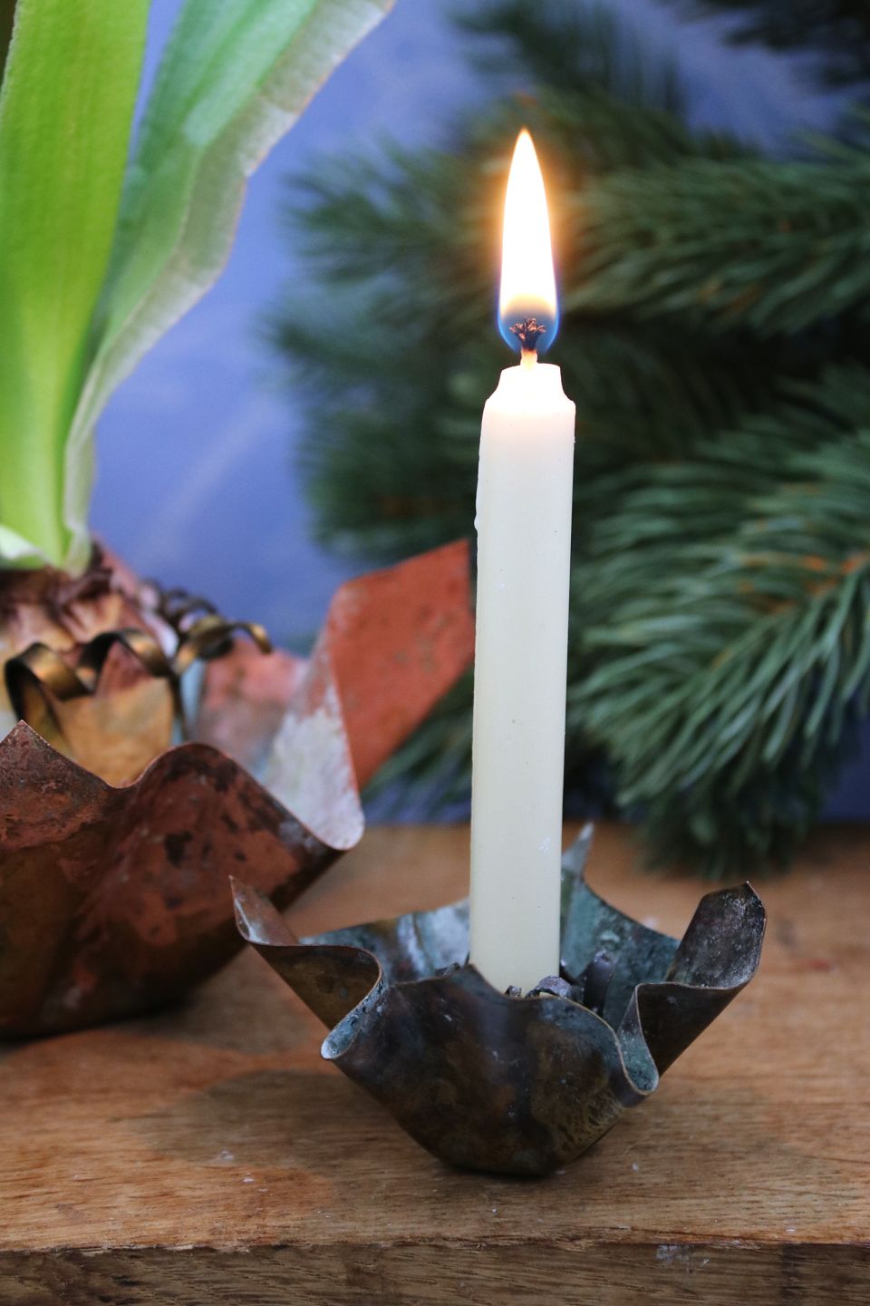 Decorative, older copper candlesticks in 2 sizes designed by floral artist Tage Andersen.