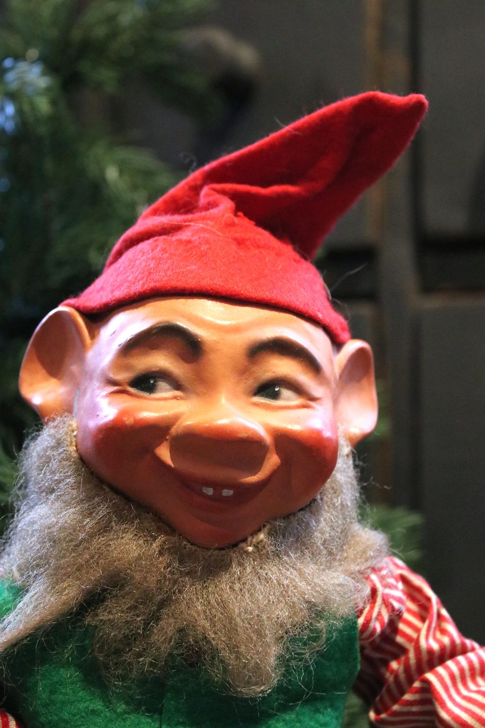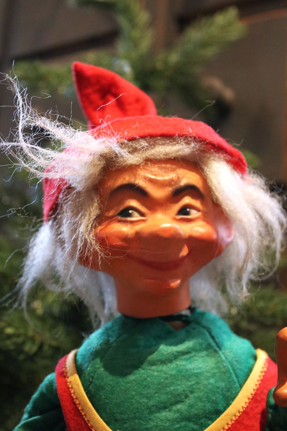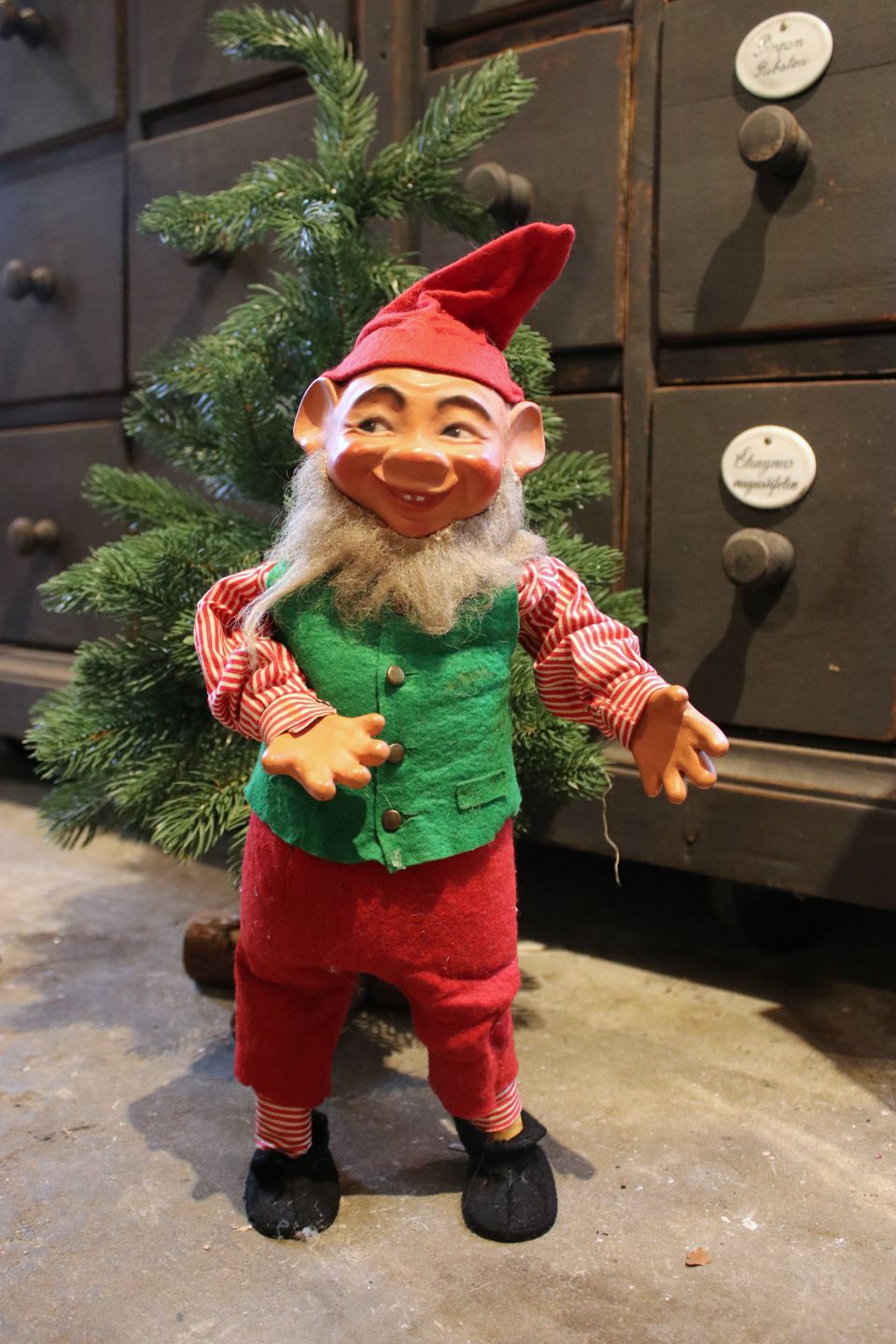 2 old shop elves with felt clothes and faces in painted papier-mâché. (Mother and Father) Height: 40cm. Sold individually!Item number: Nisse mor & far