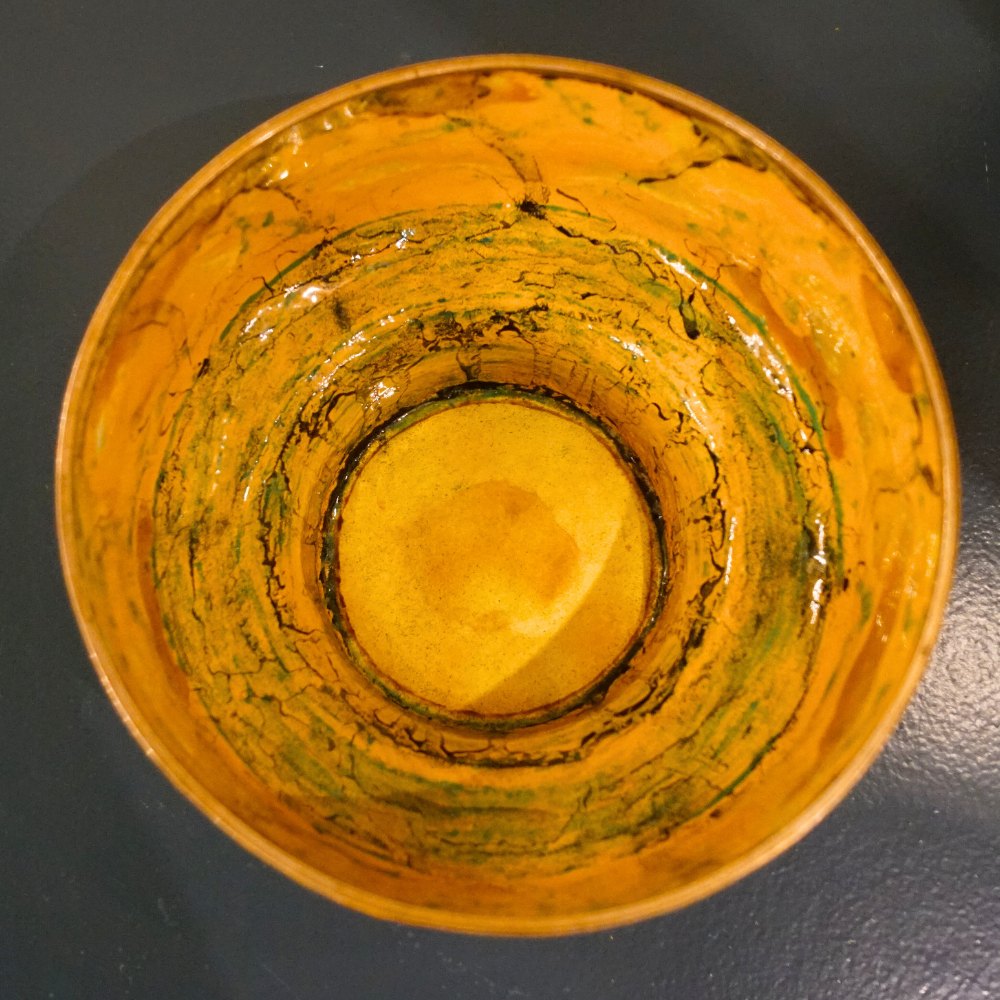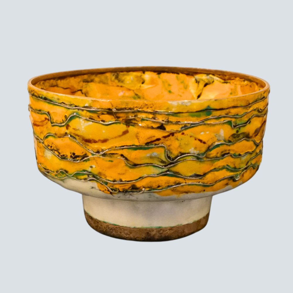 Inger Hanmann for Anton Michelsen; Sterling silver bowl decorated with enamel in white, yellow and green shades. D. 21 cm, H. 13.5 cm.Inger Hanmann for Anton Michelsen.