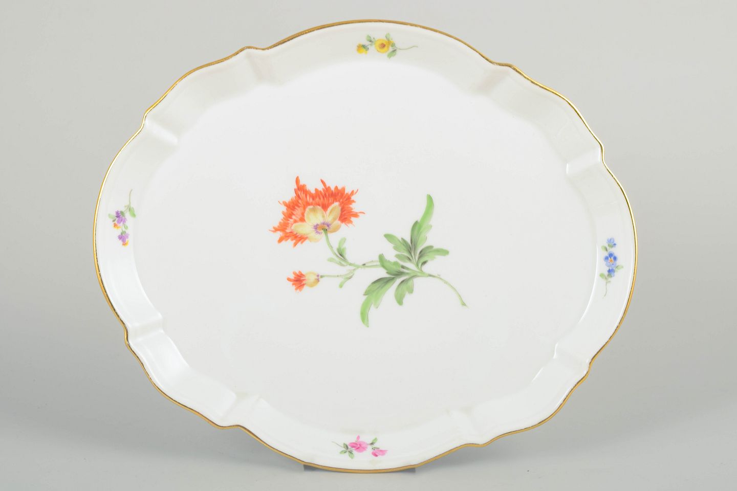 Oval Meissen porcelain tray with hand-painted polychrome floral decoration and fine gilt edging. Elegantly shaped with a softly scalloped rim.