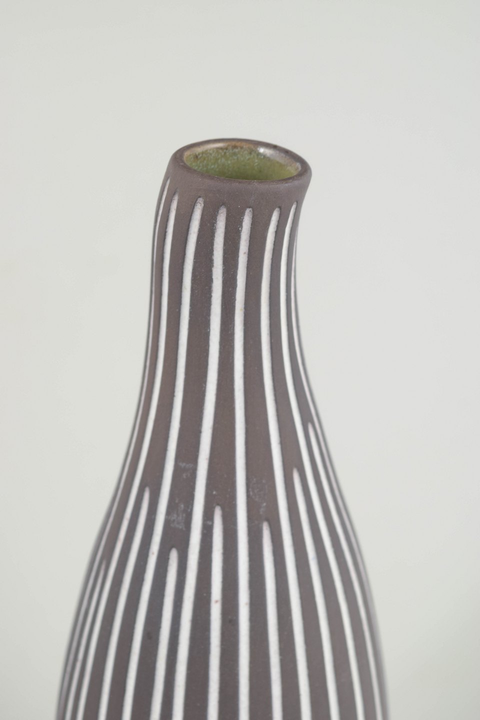 Slender, elongated stoneware vase with characteristic hand-painted white striped décor on a dark brown body. An elegant example of Nordic modernist design.