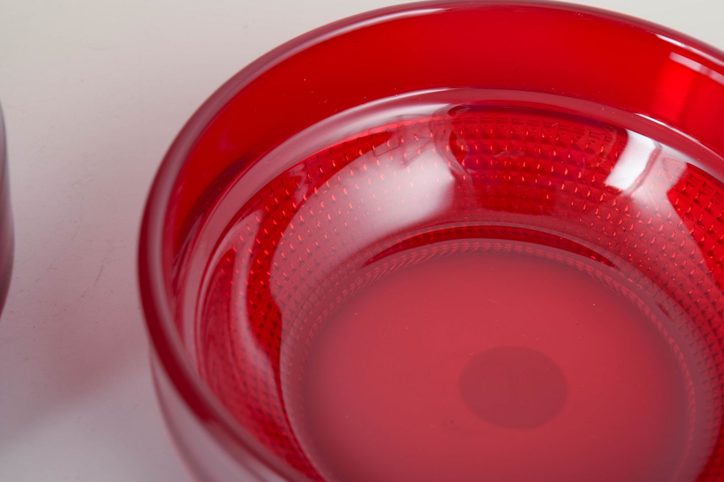 Set of four deep bowls in ruby-red art glass from Gullaskruf, model “Vineta,” known for its optical texture and intense colour saturation. A refined example of mid-century Swedish glass design.