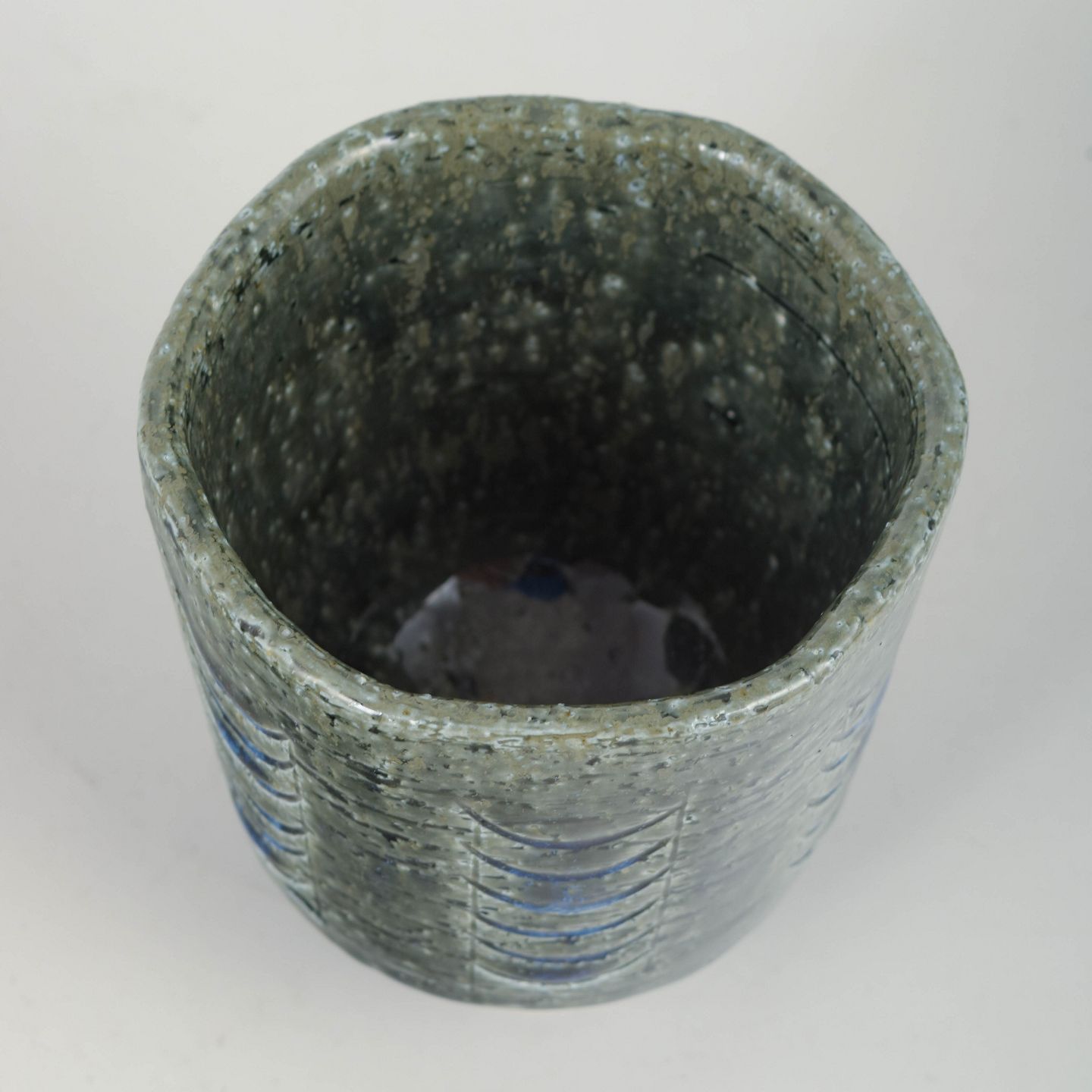 Annelise and Per Linnemann-Schmidt for Palshus – Vase, 1970s.Small cylindrical stoneware vase with incised arc motifs in blue tones and the characteristic Palshus ash glaze. Signed.
