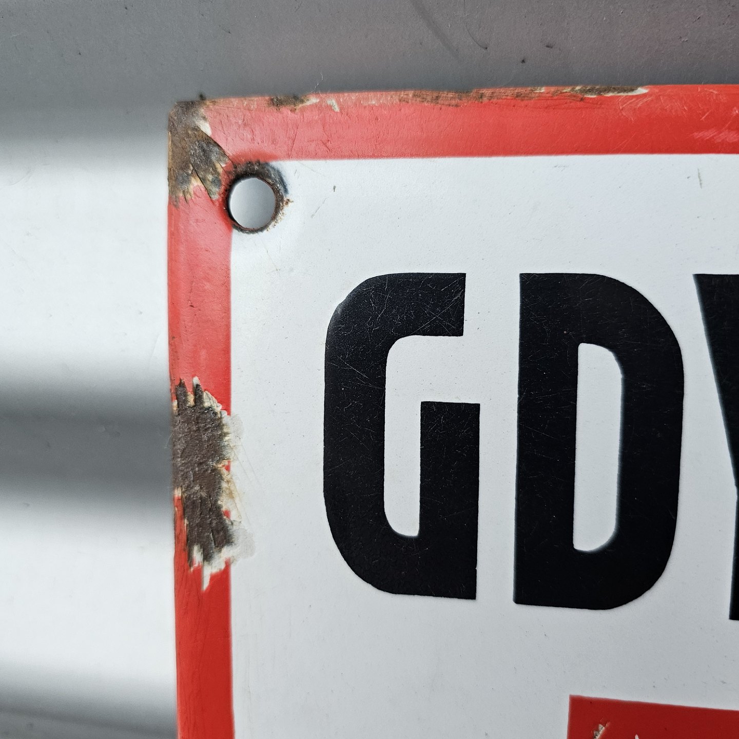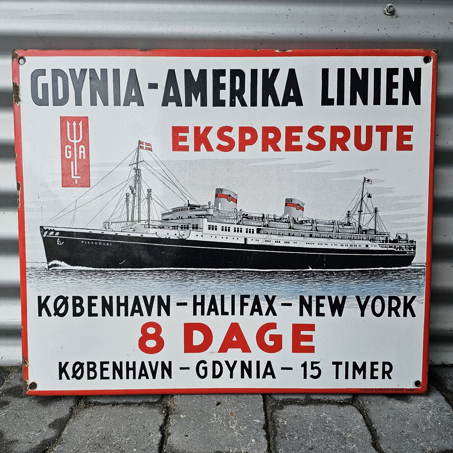 Skilt i emalje med information om Skibsruten Gdynia-Amerika LinienEkspresrute 8 dage