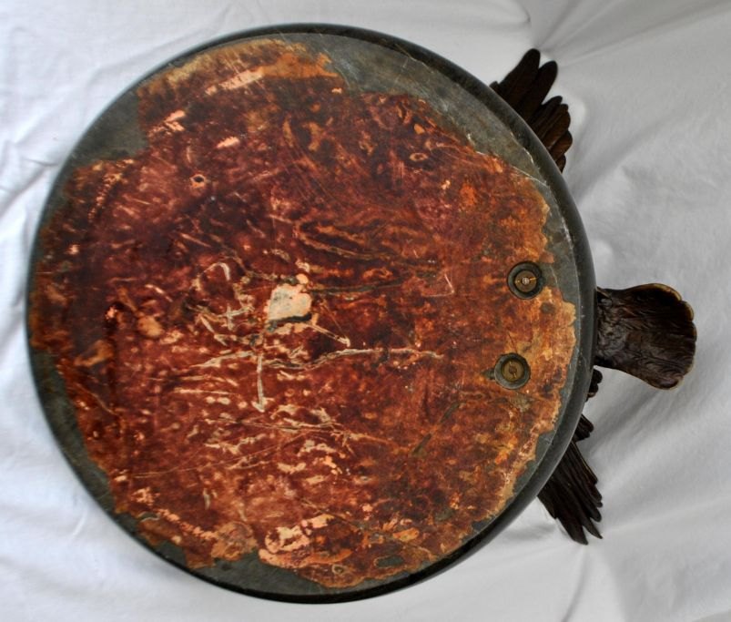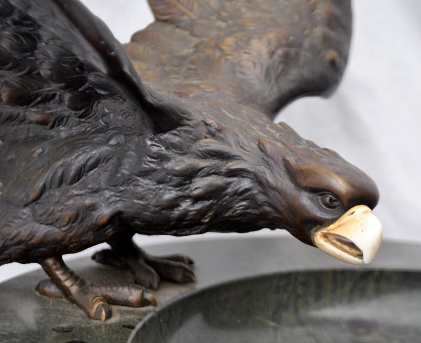 Large French bronze eagle mounted on a marble dish, art nouveau, circa 1900. Eagle with spread wings and ivory beak. Marble platter in green. Platter dia: 35 cm. Eagle: W: 40 cm. H.: 23 cm.Truly amazing piece!