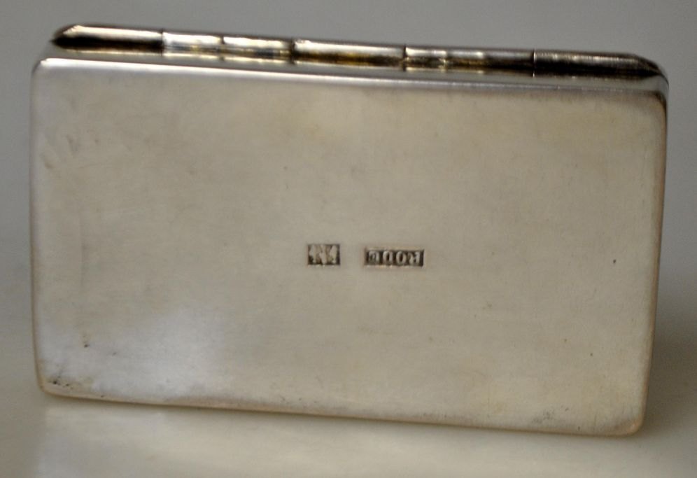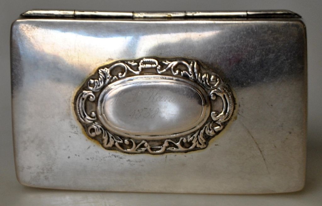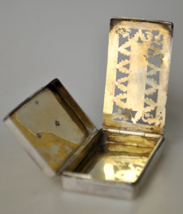 Carl Christopher Rode (1826 - 1902) Åbenrå, Denmark: Silver scent box. Stamped with master's mark and town seal. Inside gilded and lattice with acorns and oak leaves. 7.5 x 4.5 x 1.5 cm. Weight: 68 grams.On the lid engraving: HP Hansen 1858.