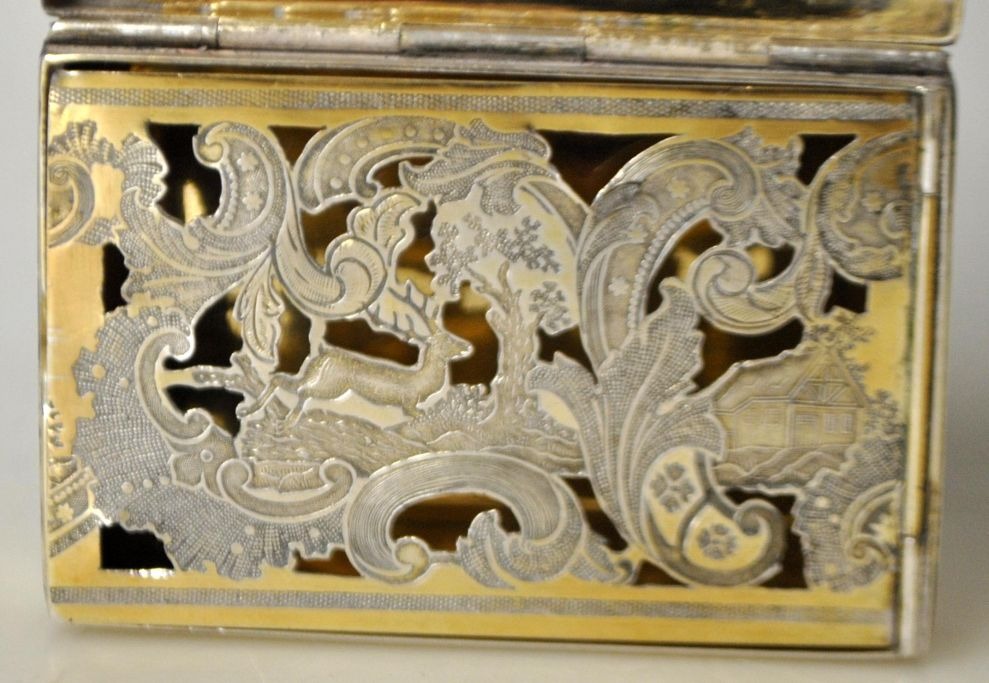 Peter Erichsen (1826 - 1869) Haderslev, Denmark: Silver centbox. Stamped with master's mark and city coat of arms. Inside gilded and lattice with rococo patterns with jumping deer, house and trees. 6.5 x 4.5 x 1.8 cm. Weight: 54 grams.Under bottom engraving: JP Holm and E. Simonsen.