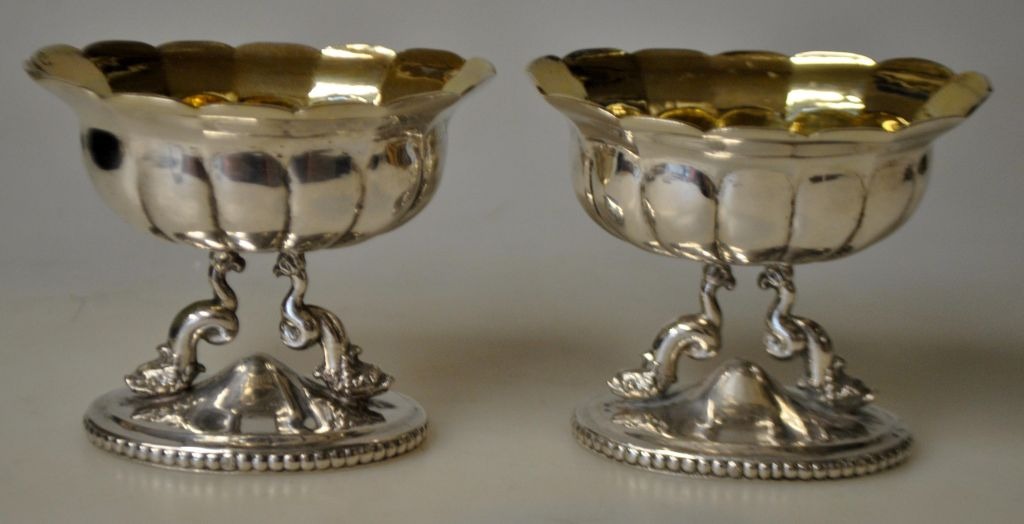 Jürgen Joachim Jürgensen (1779 - 1837) Sønderborg, Denmark: Pair of Danish rococo silver salt shakers, 1828. The salt shakers are held by two dolphins. Inside gilded. Stamped. H.: 6.5 cm. L.: 8.4 cm.The silversmith became known as the creator of the large goblet-shaped so-called "100 stone eggs".