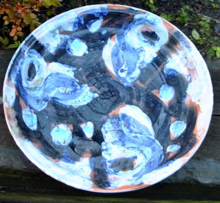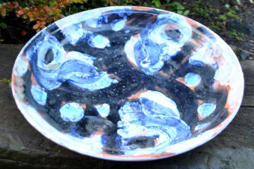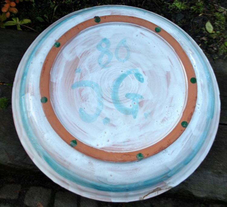Glud, Jørgen (1913 - 2003) Denmark: ceramic dish, 1980. Red clay. Glaze in black, blue, white and green. Signed: JG 80. Dia: 37 cm.Item number: 28648