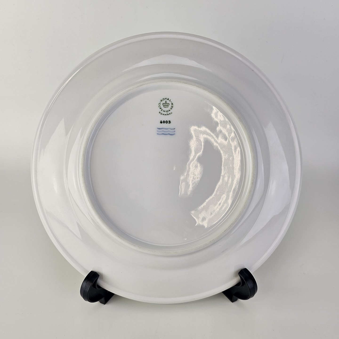 Sæt hotelporcelæn af flade middagstallerkener, flade frokosttallerkener og dybe tallerkener i kongeligt porcelæn dekoreret med røde streger og logoet for Holm & Wonsilds rederi